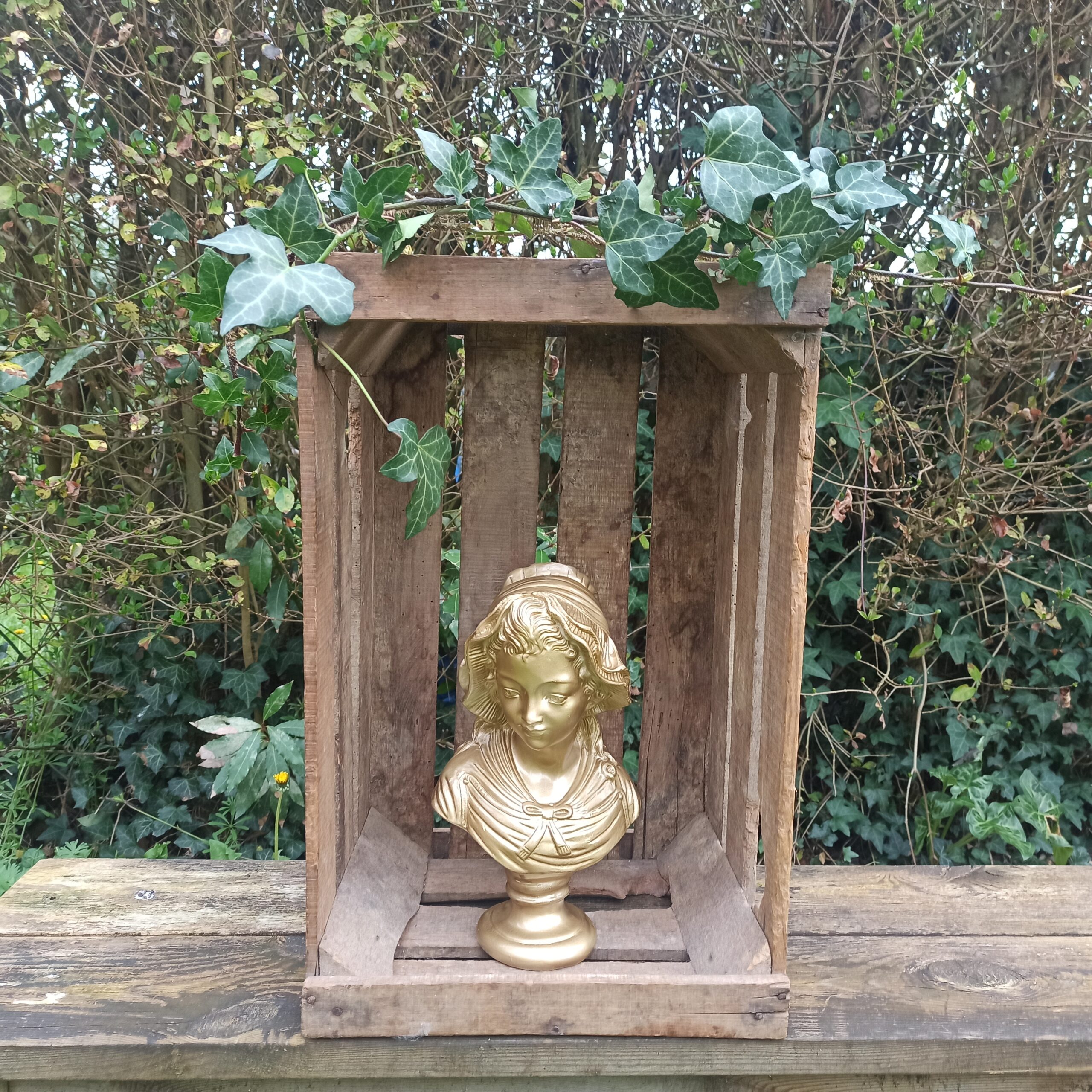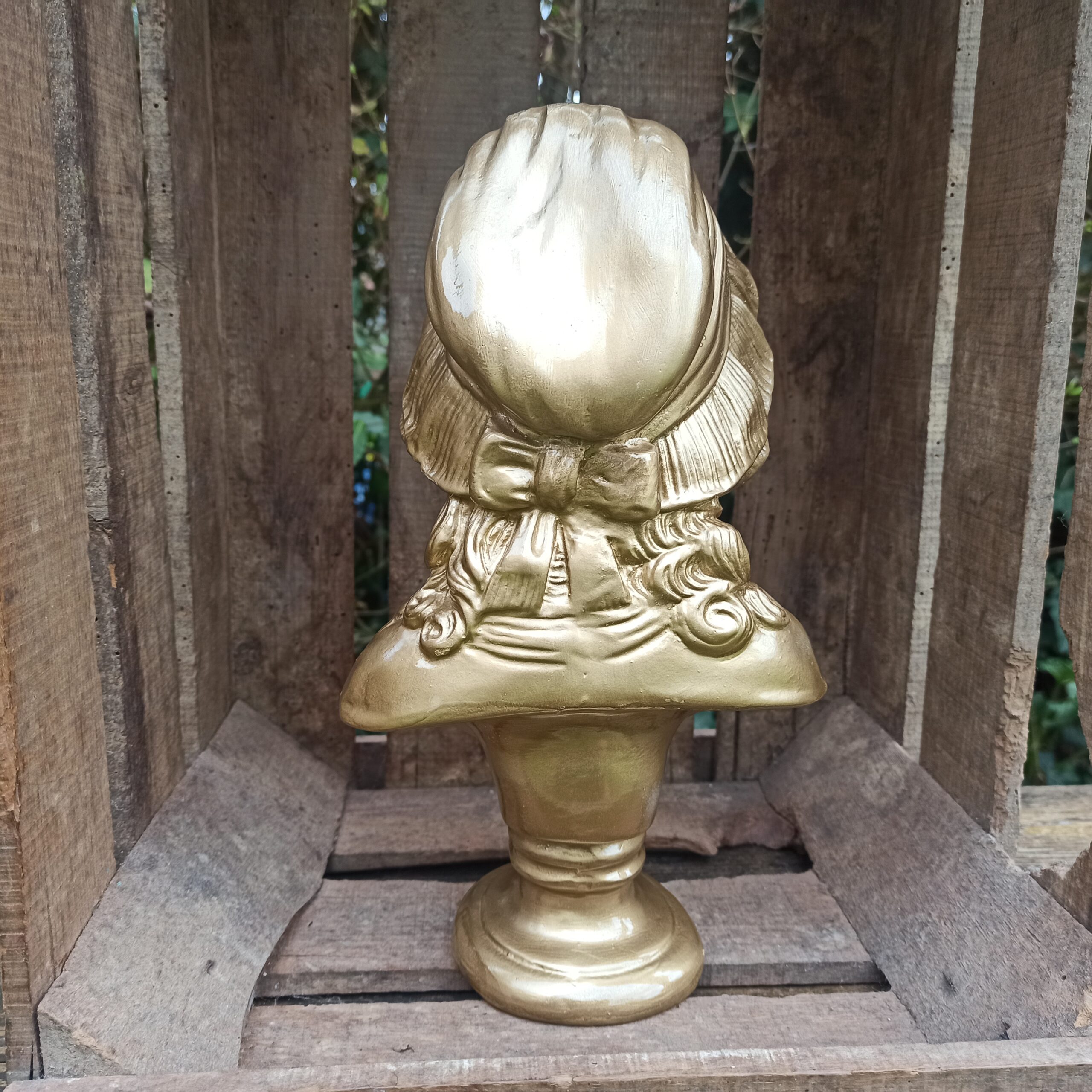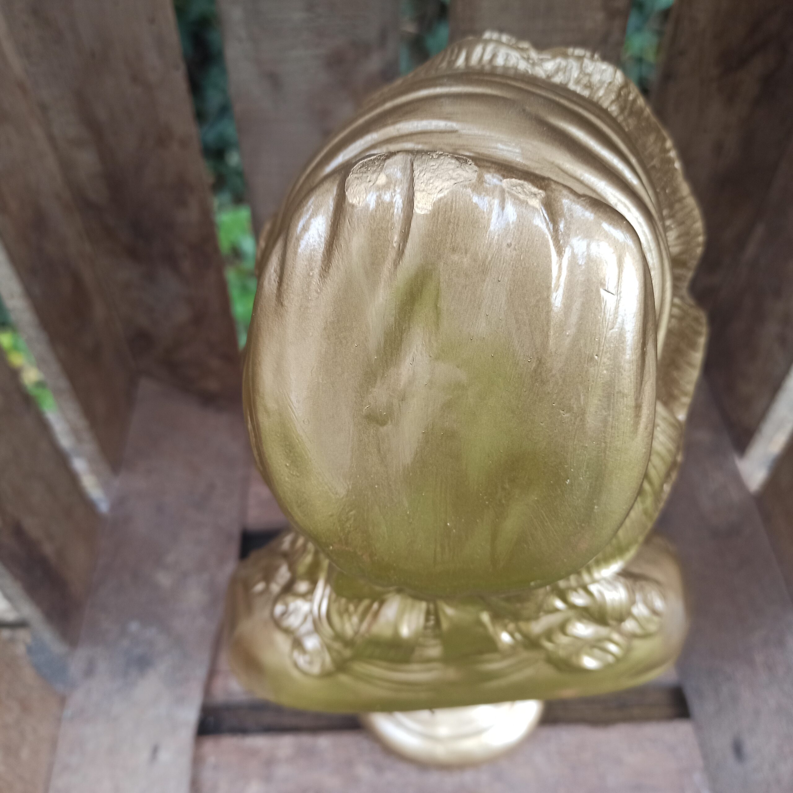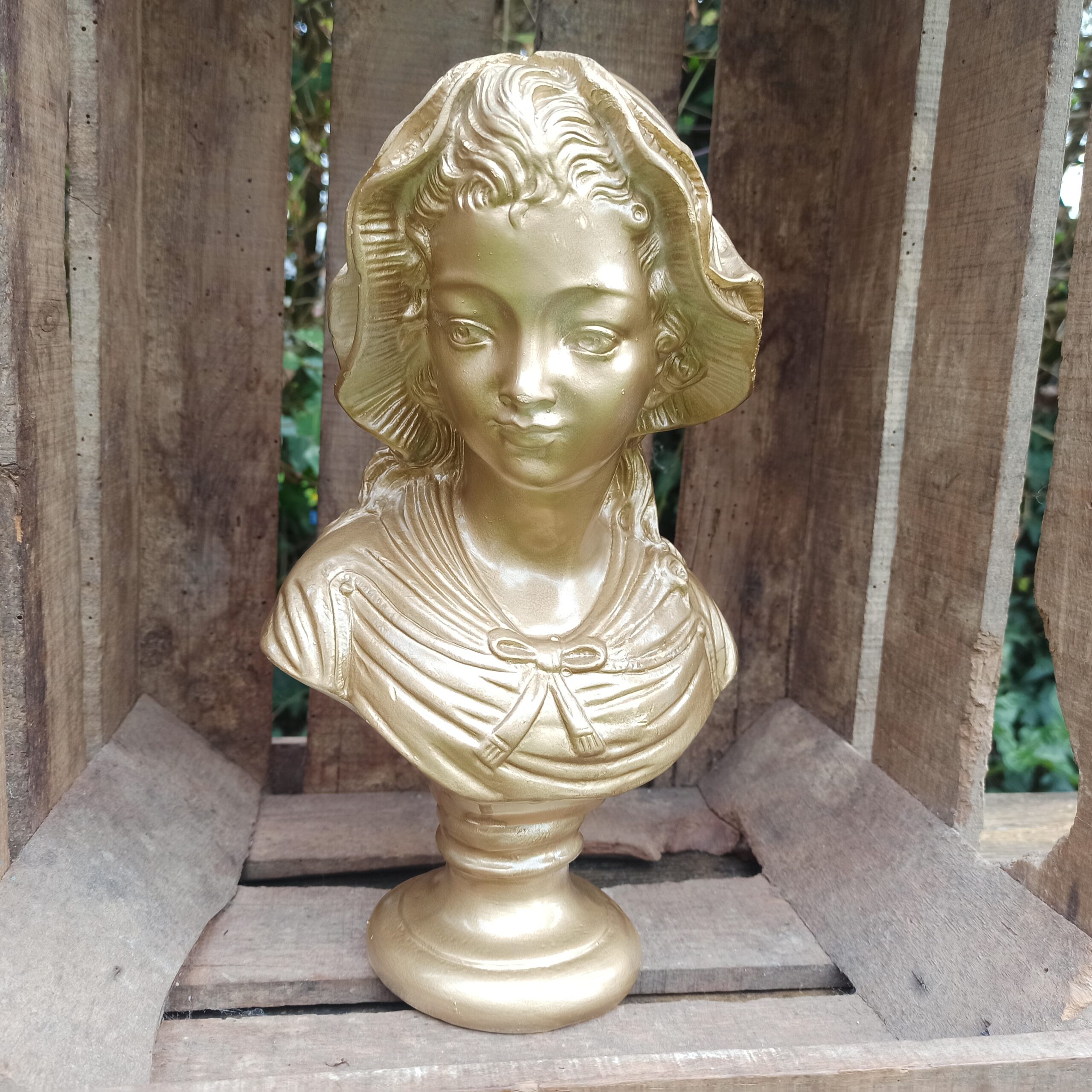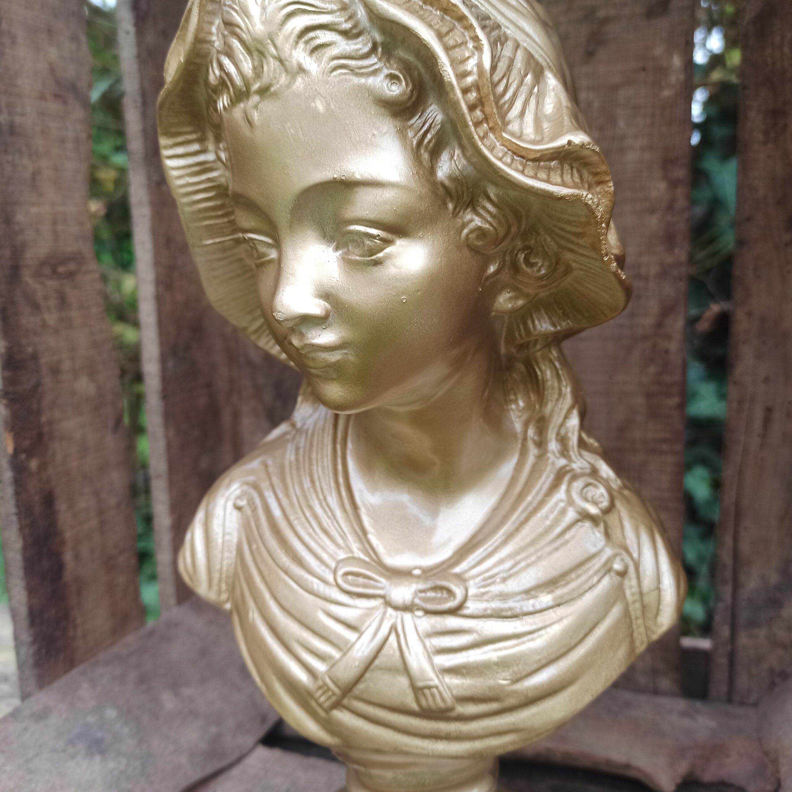 Buste en plâtre. Patine doré métallisée. Statue buste de femme pouvant aller dehors (sous abri). Hauteur 30. Profondeur 10. Marques du temps mais bel état général.
