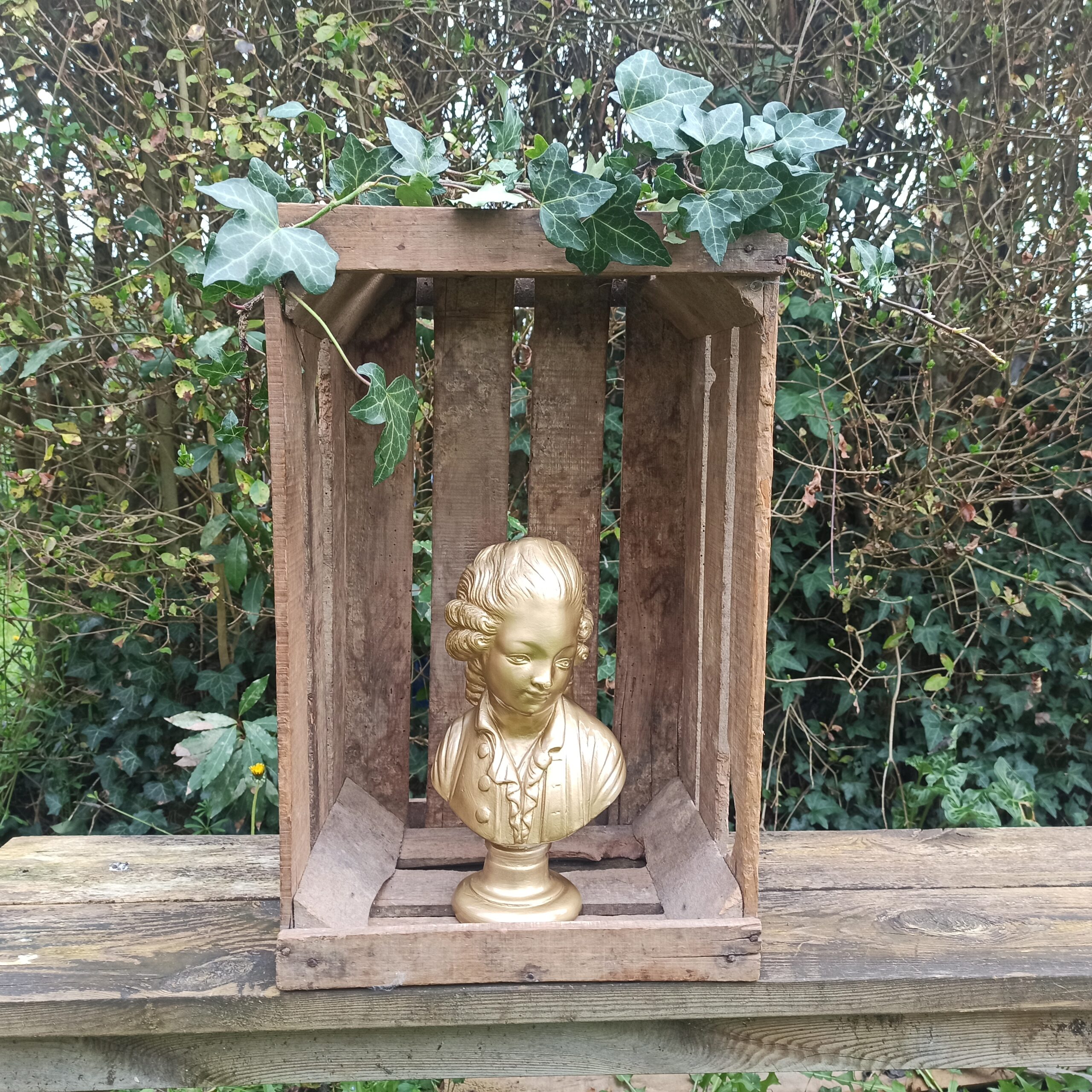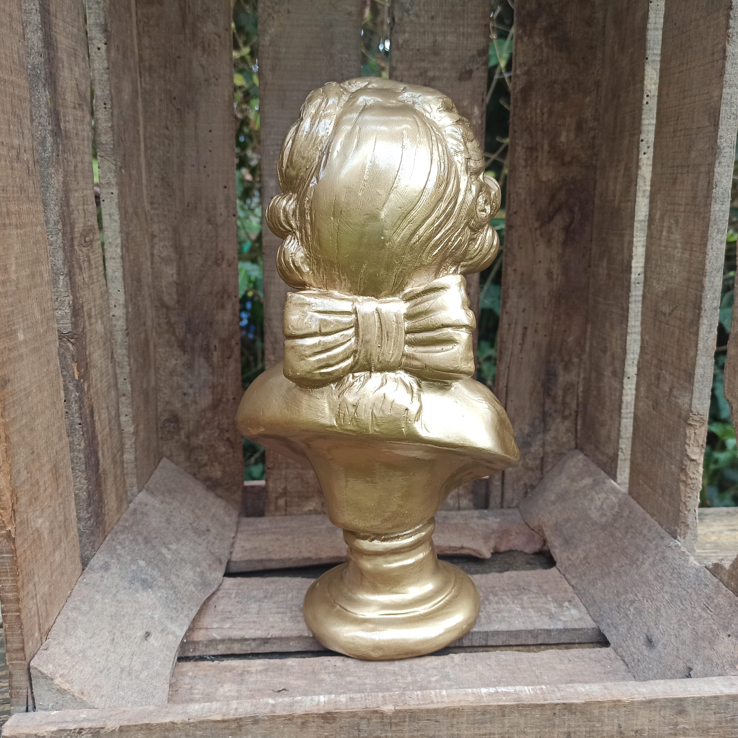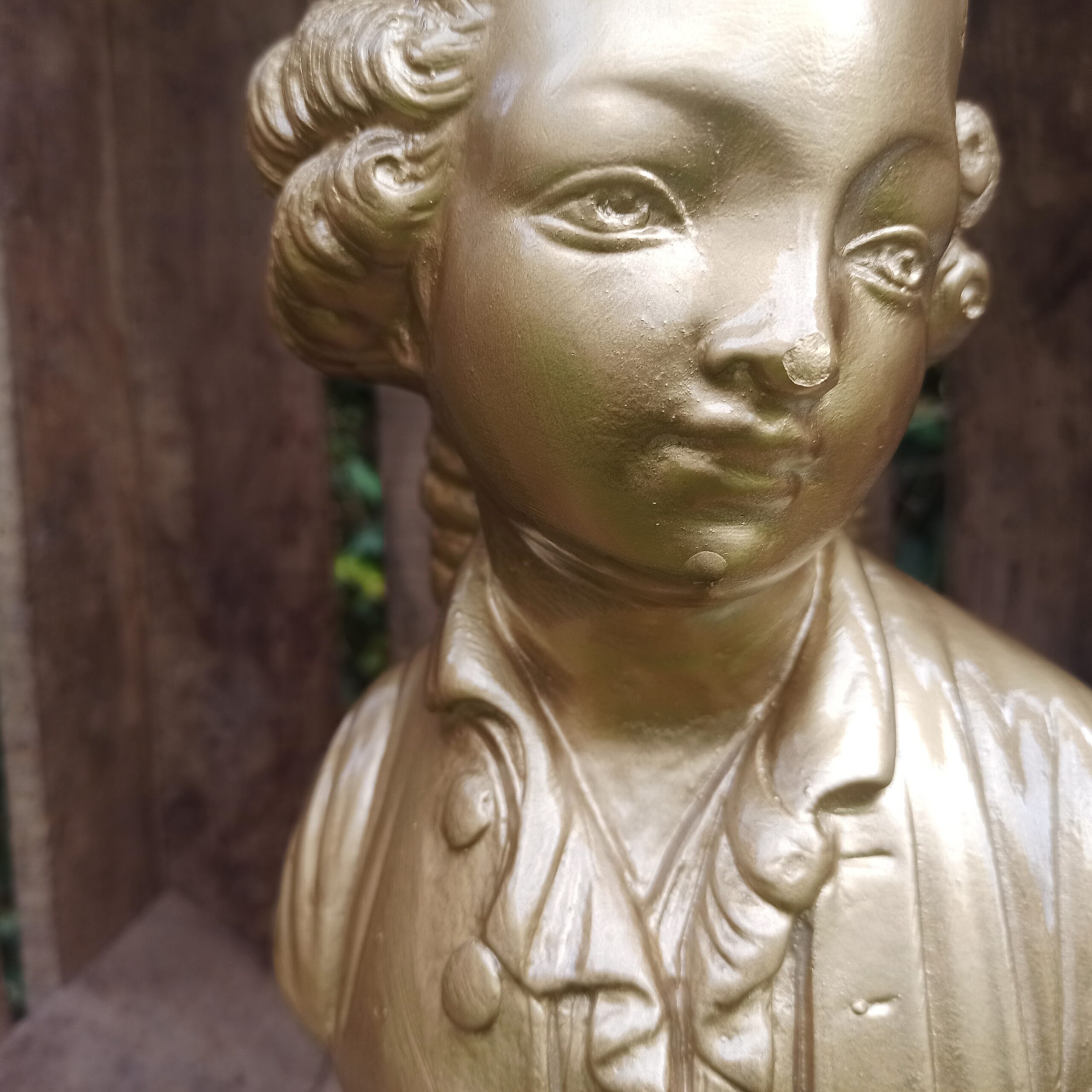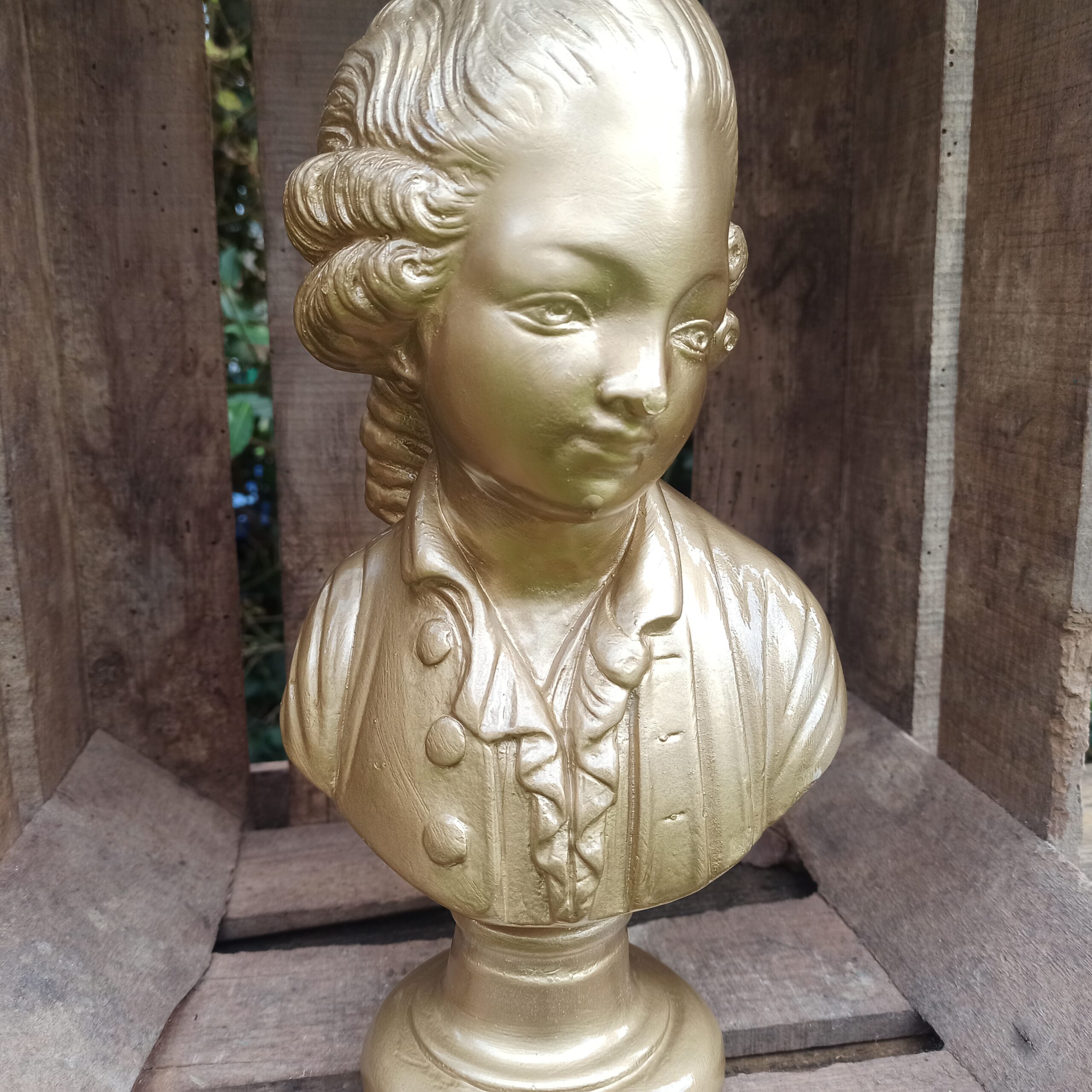 Buste en plâtre. Patine doré métallisée. Statue buste de femme pouvant aller dehors (sous abri). Hauteur 30. Profondeur 10. Marques du temps mais bel état général.