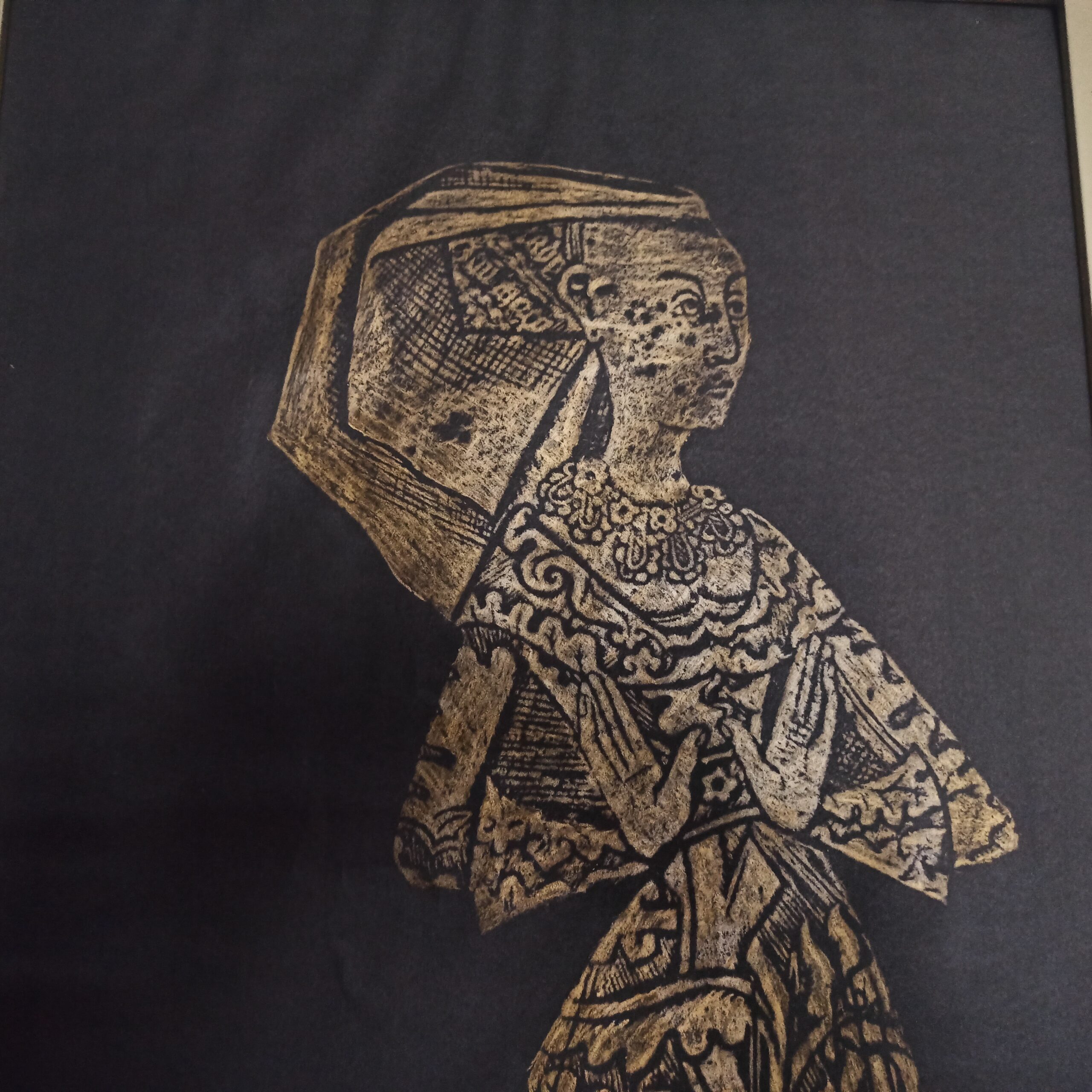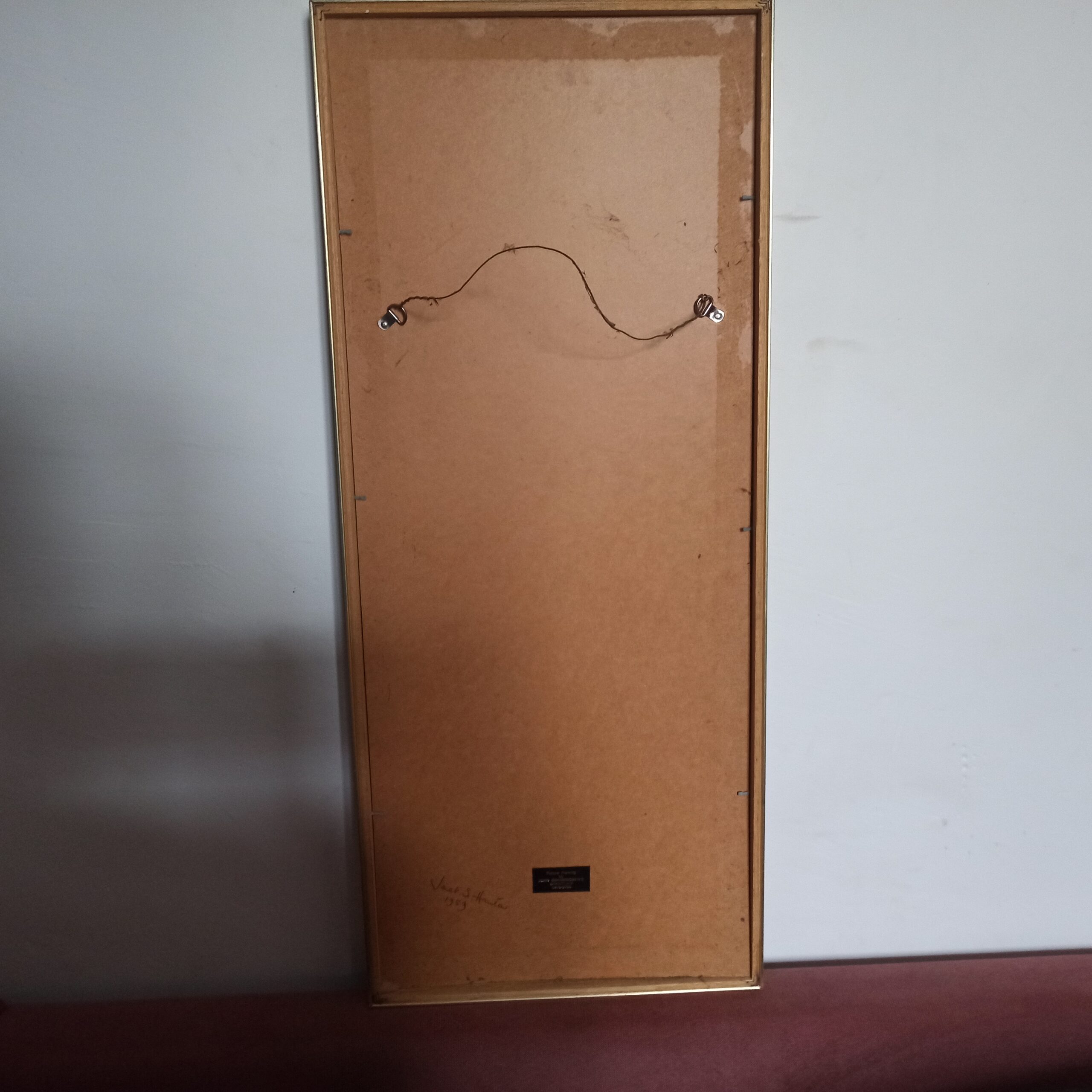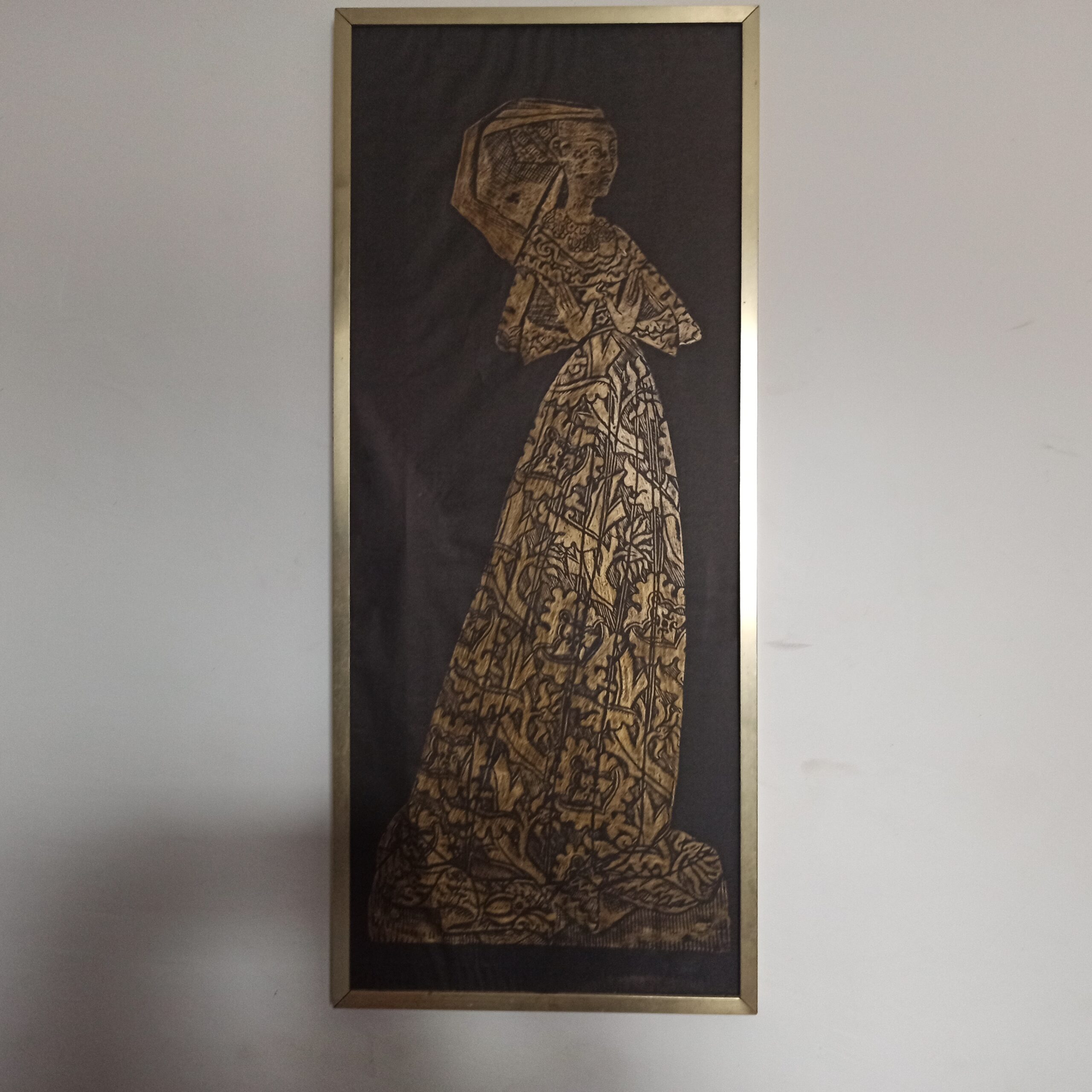 Cadre avec peinture sur papier noir. Représentant Margaret Bernard. Réalisation vintage. Années 70. 36×84.