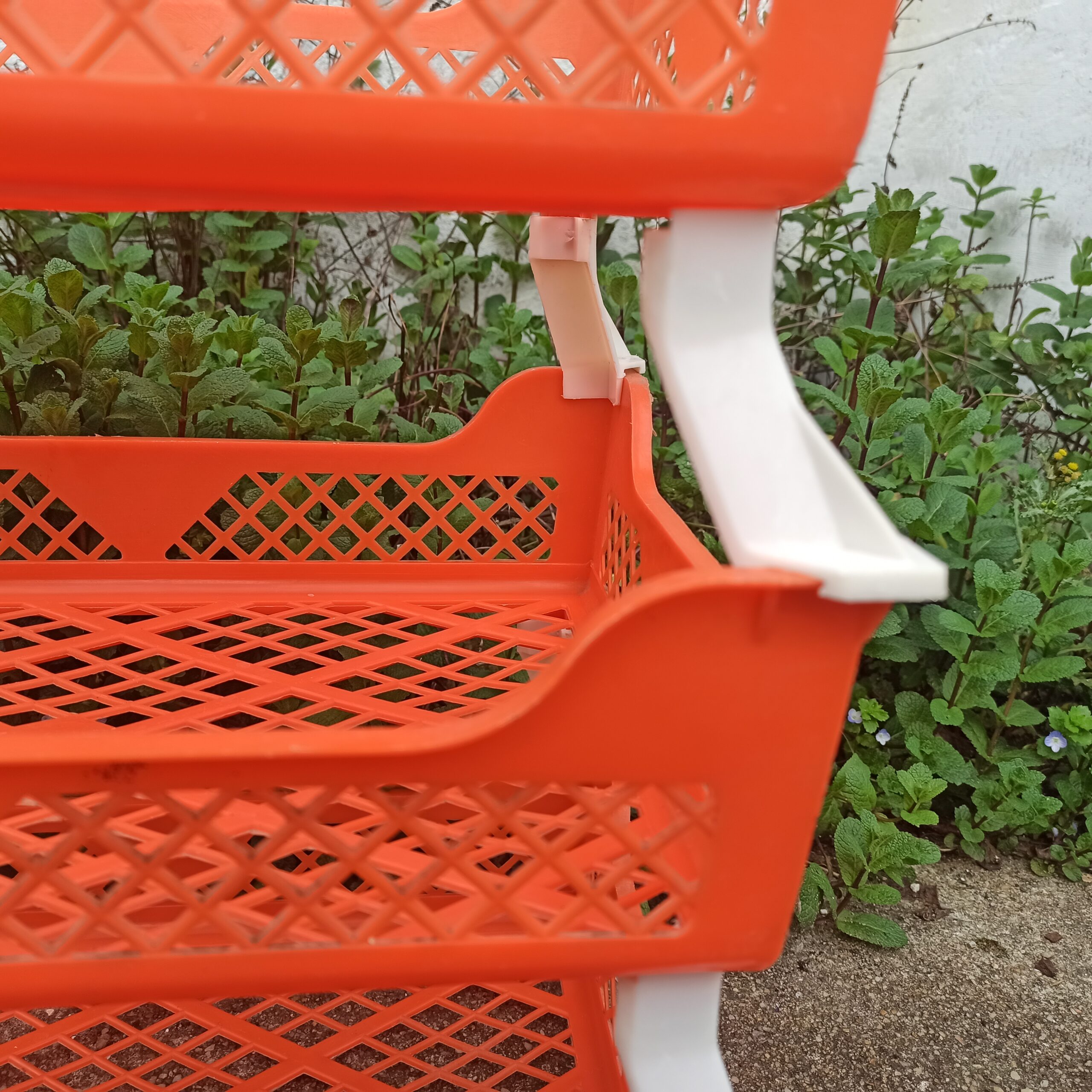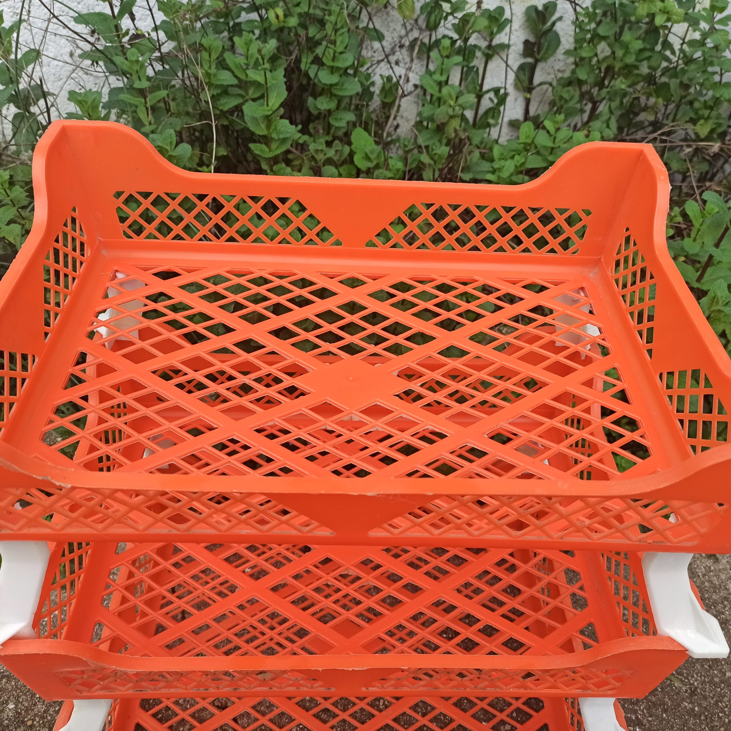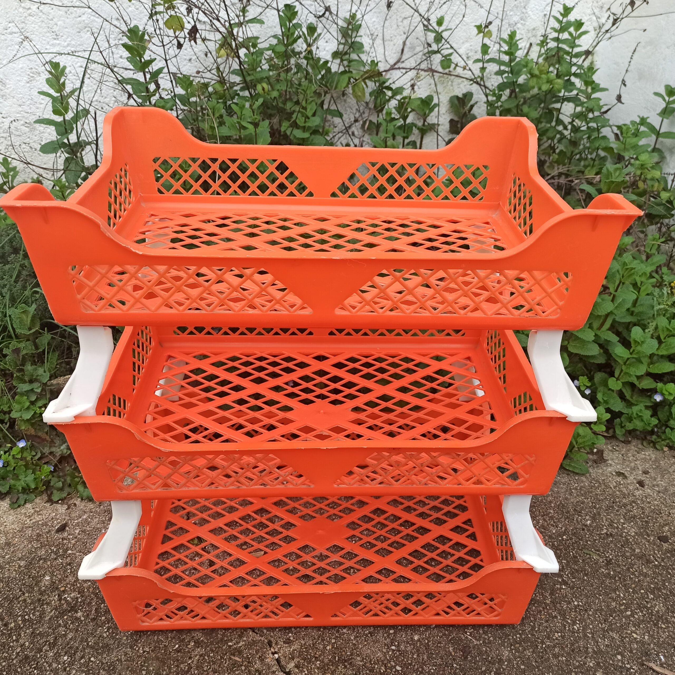 Panières à légumes vintage. Plastique orange. 3 se superposent, 1 de rechange. Se démontent. Hauteur totale 39. Dimensions d’une panière: hauteur 10. Longueur 39. Largeur 27.