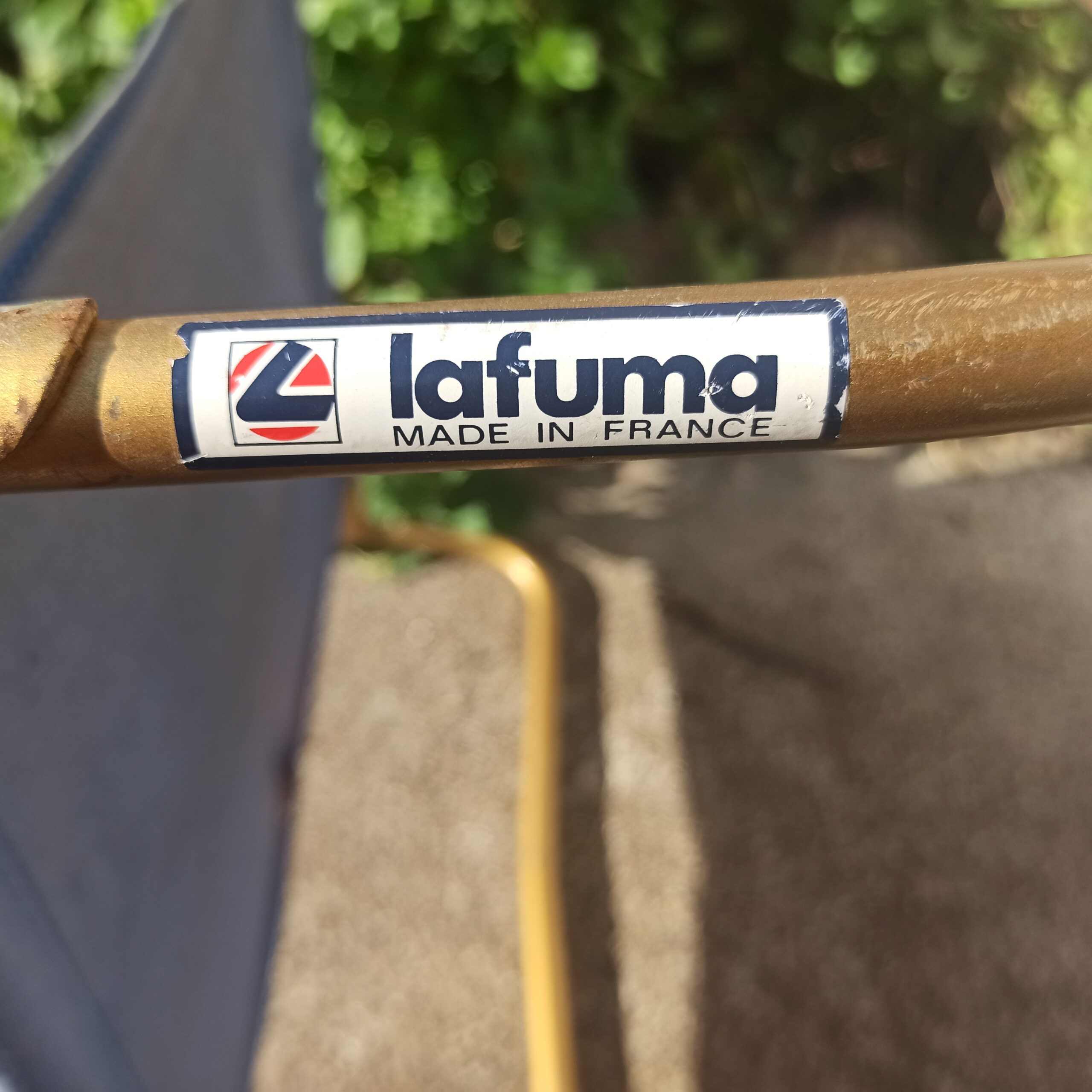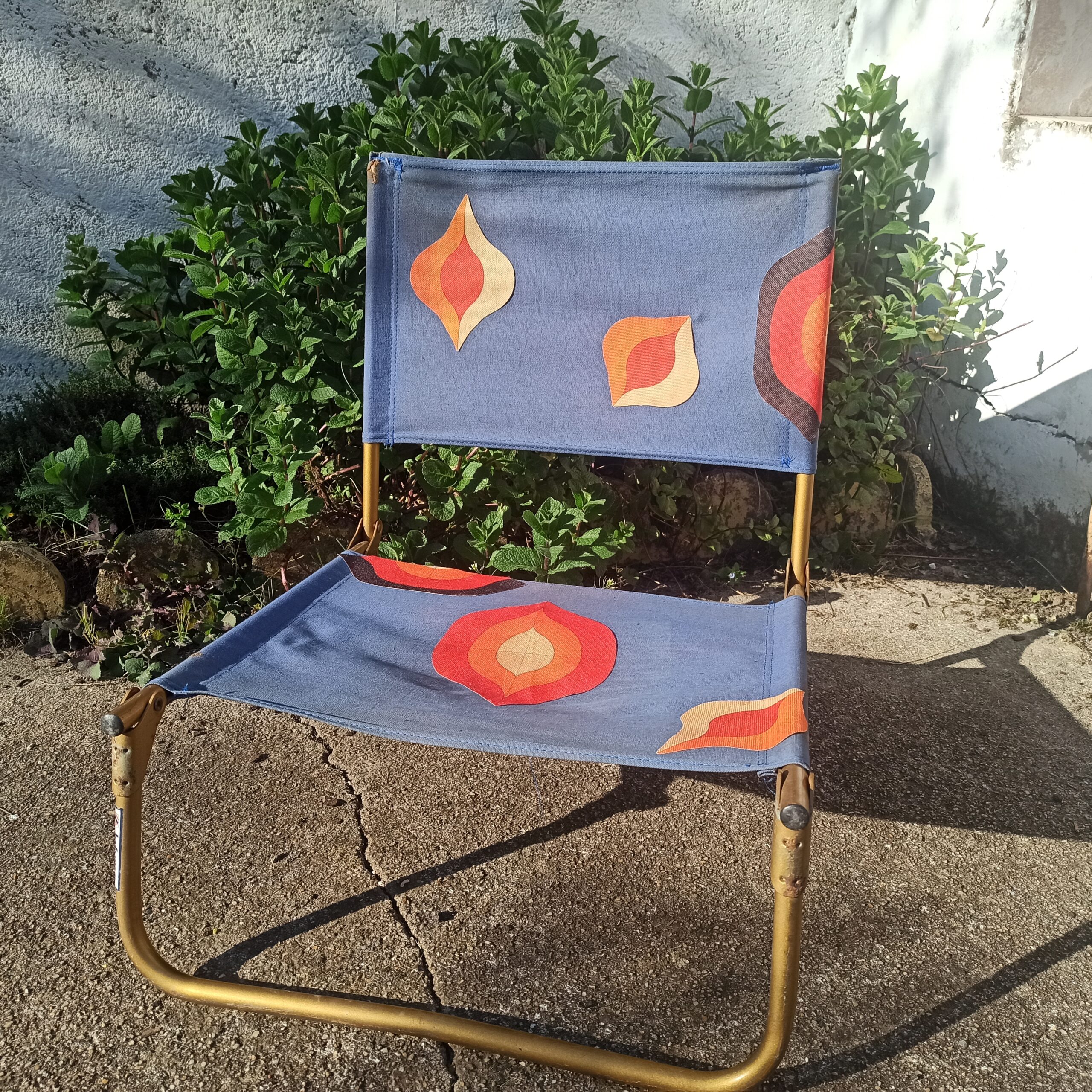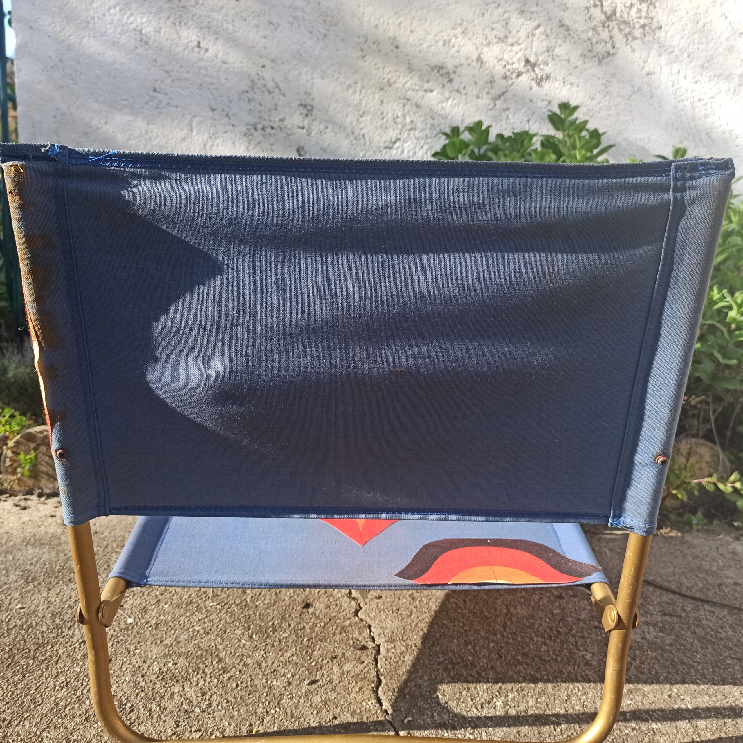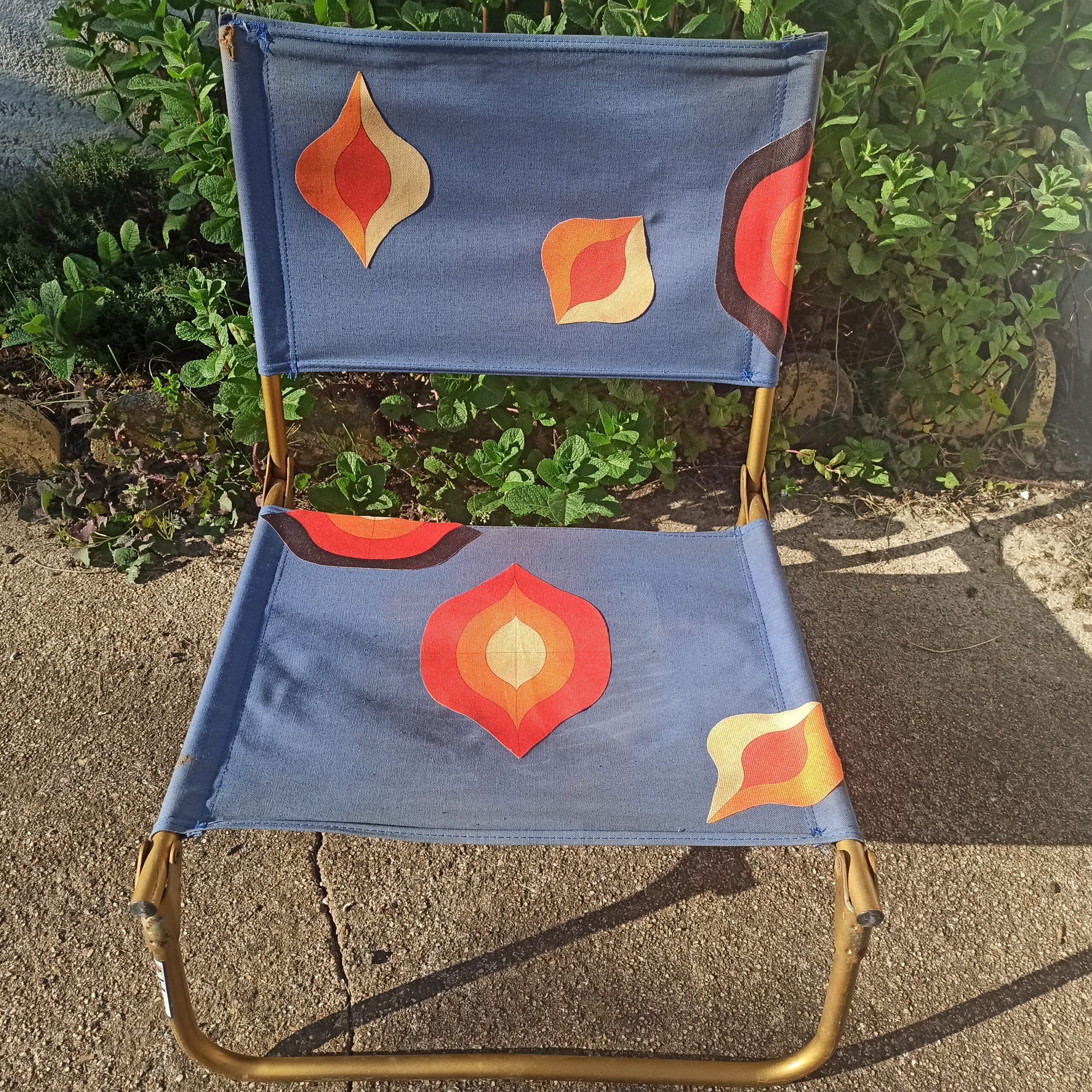 Fauteuil de plage marque Lafuma. Fabrication Française. Structure métal patine doré. 100% coton. Traces d’usures, mais assise et dossier en bon état. Le tissu, formes géométriques a été rajouté. Hauteur 50. Hauteur assise 15. Largeur 45. Se plie.