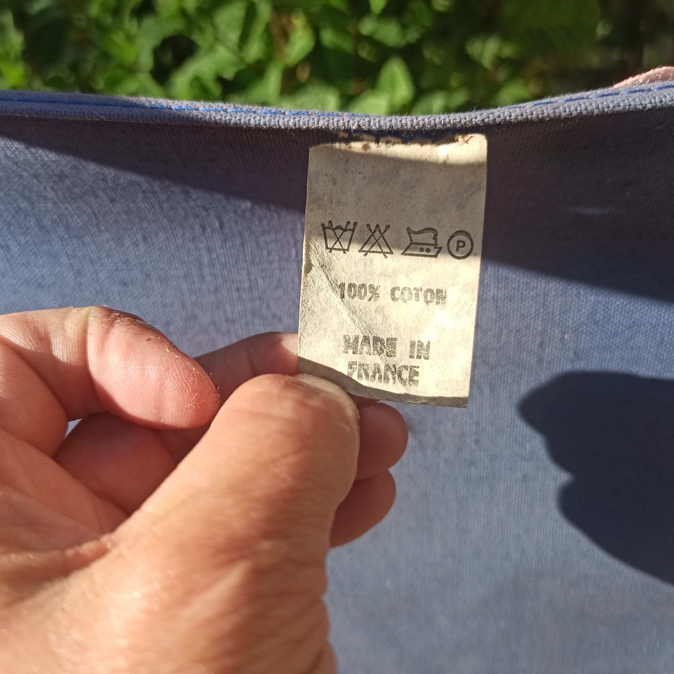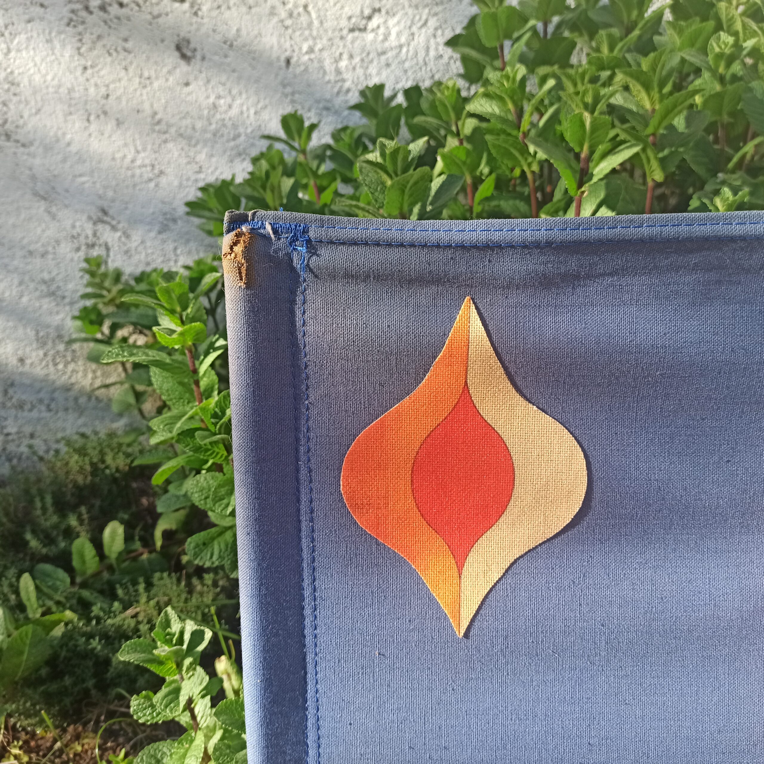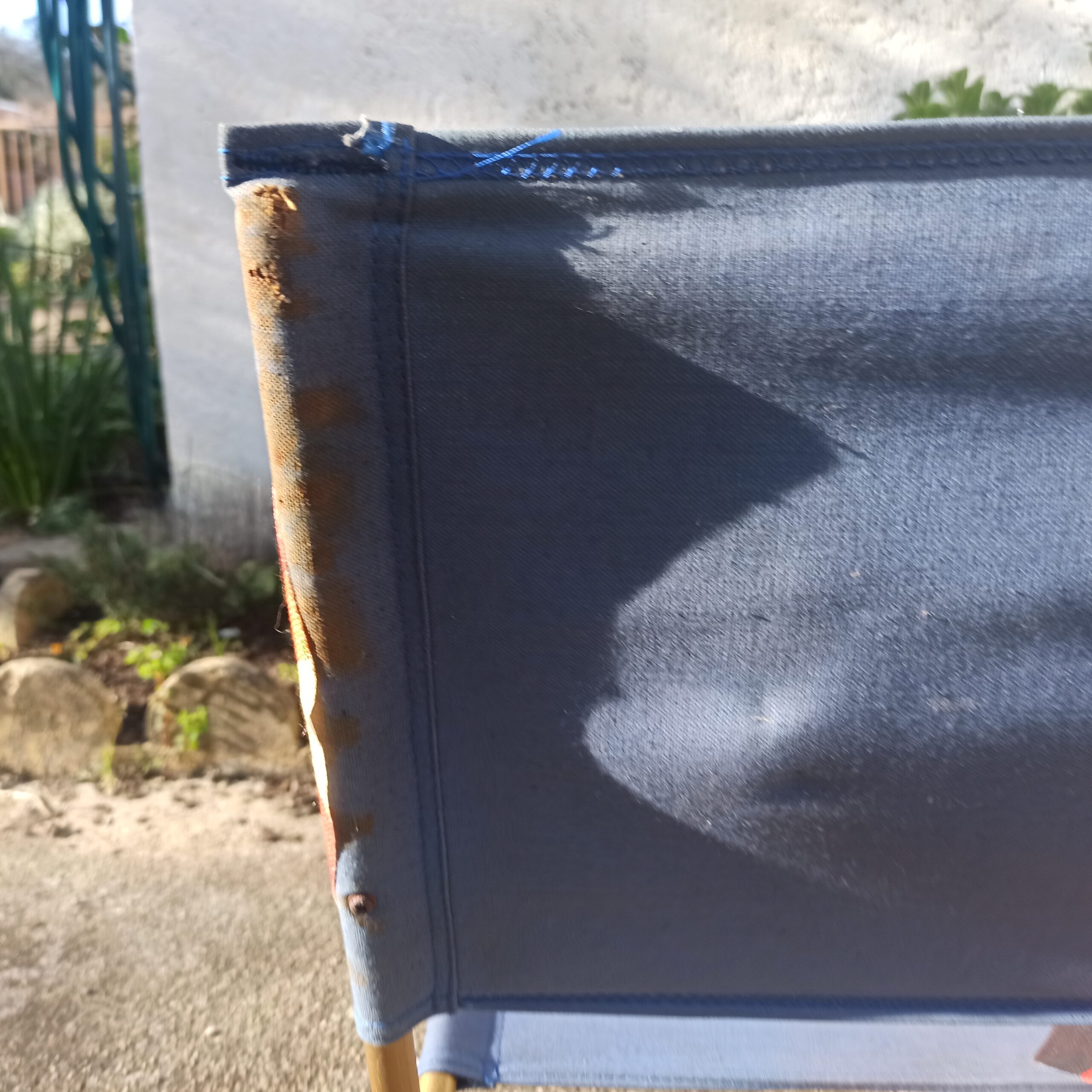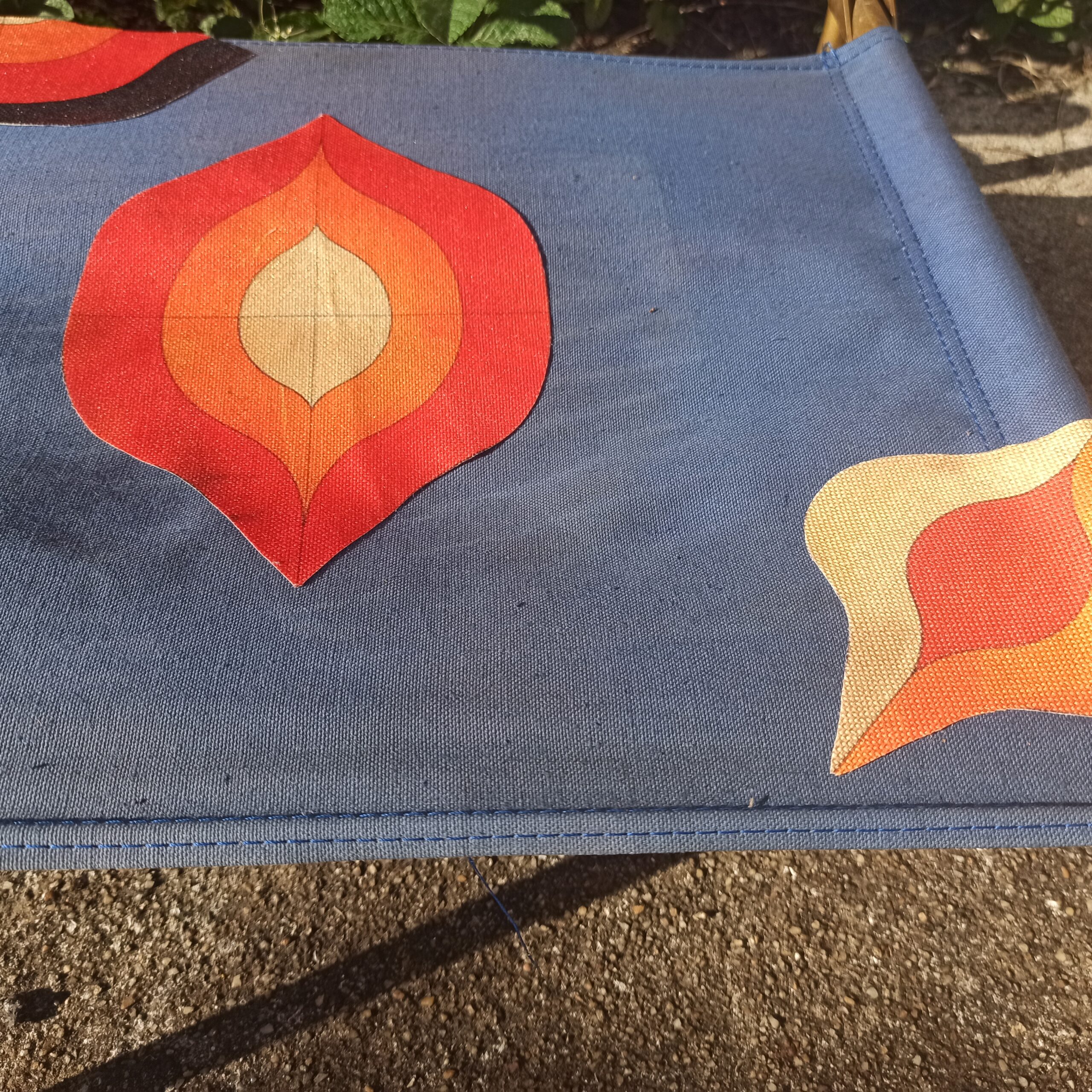 Fauteuil de plage marque Lafuma. Fabrication Française. Structure métal patine doré. 100% coton. Traces d’usures, mais assise et dossier en bon état. Le tissu, formes géométriques a été rajouté. Hauteur 50. Hauteur assise 15. Largeur 45. Se plie.