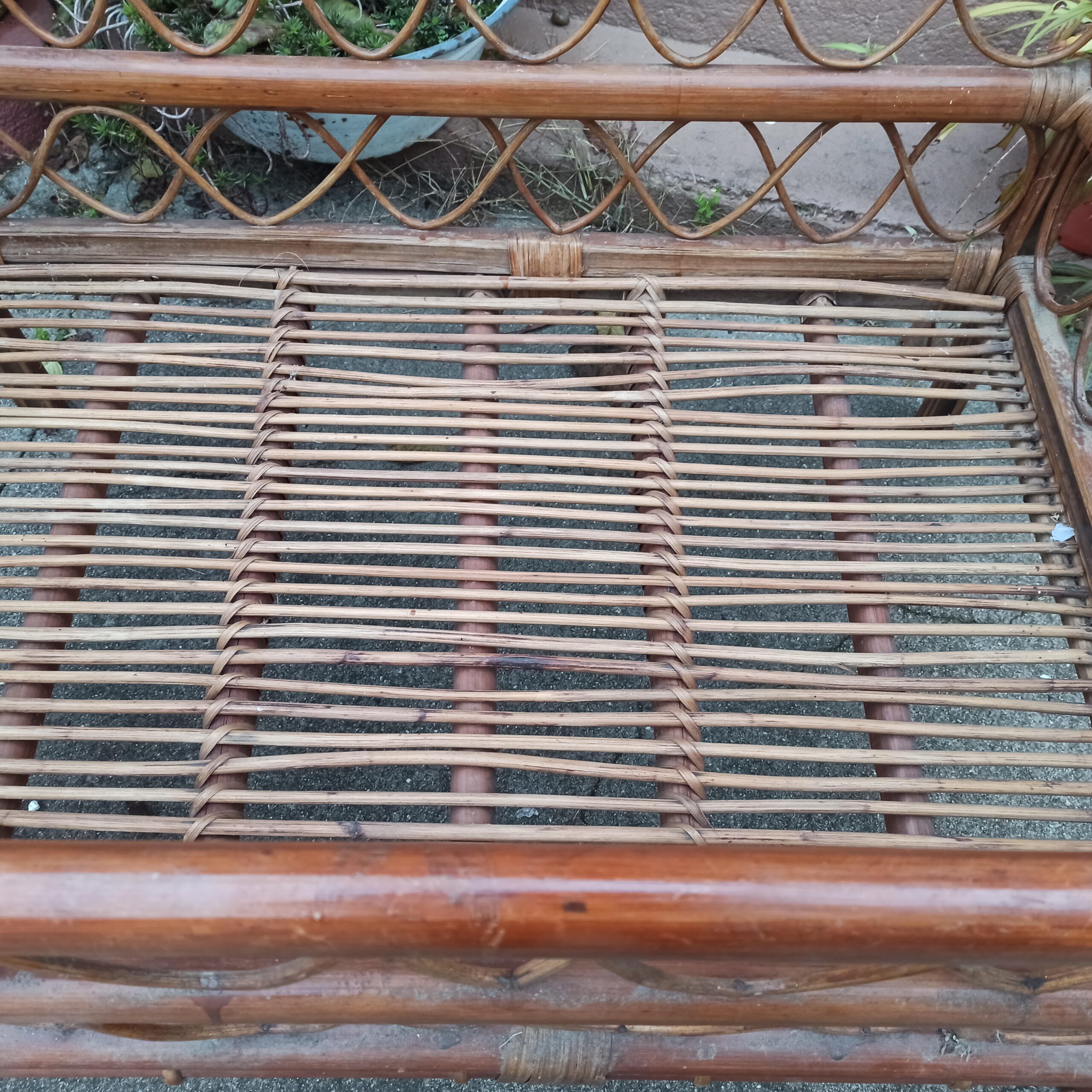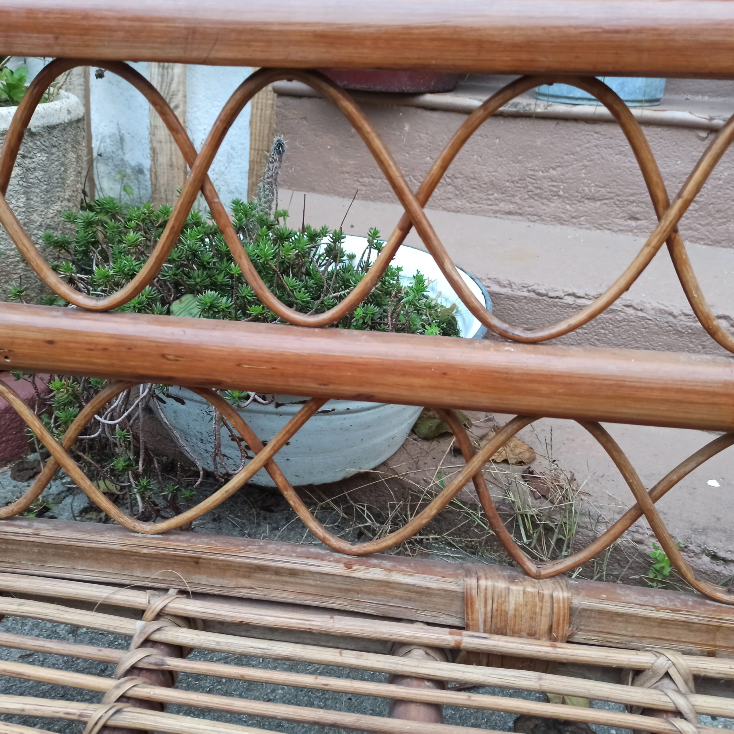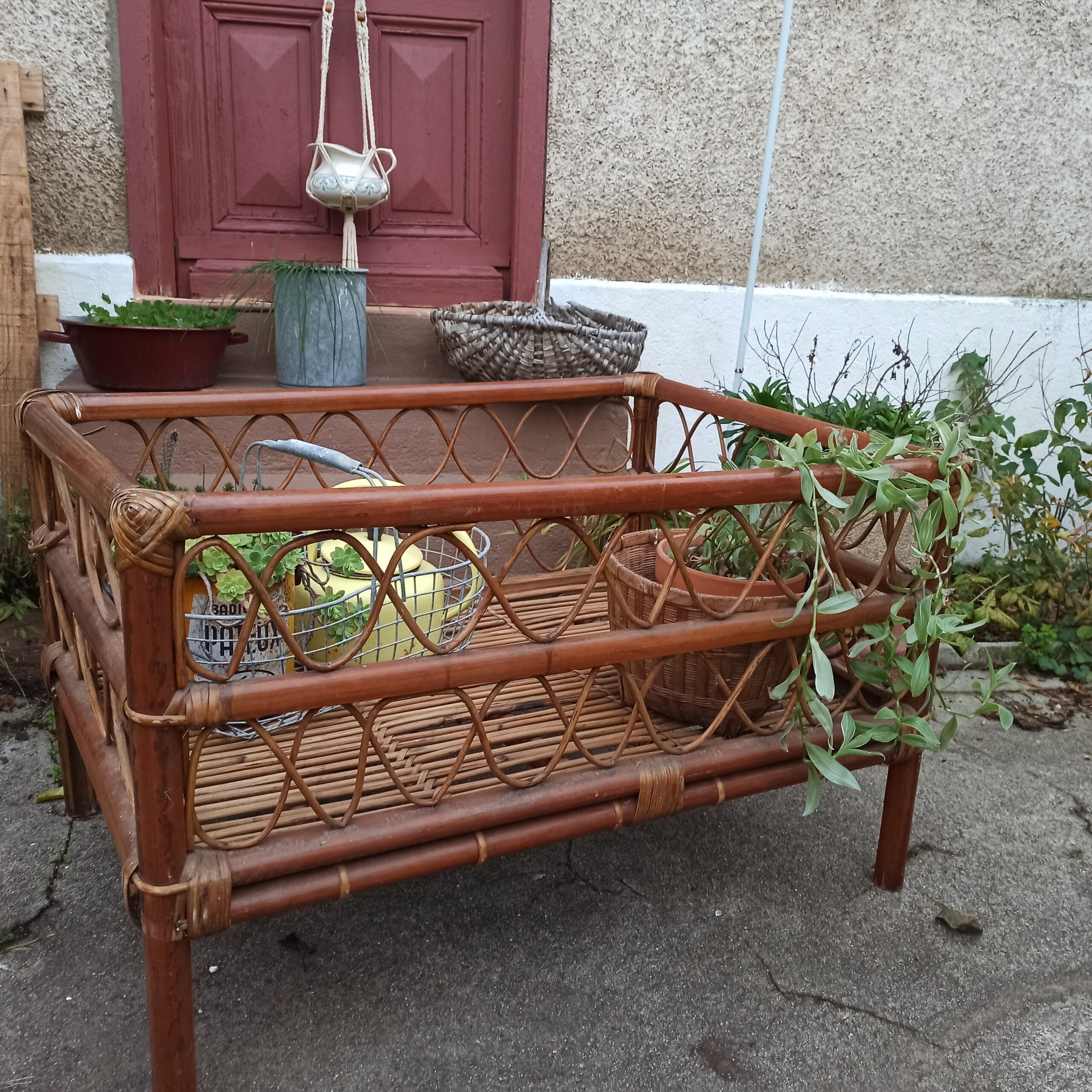 Grand porte plantes en rotin. Peu être détourné en caisse de rangement, bibliothèque… Traces d’usures. Hauteur 60. Longueur 95. Largeur 65.
