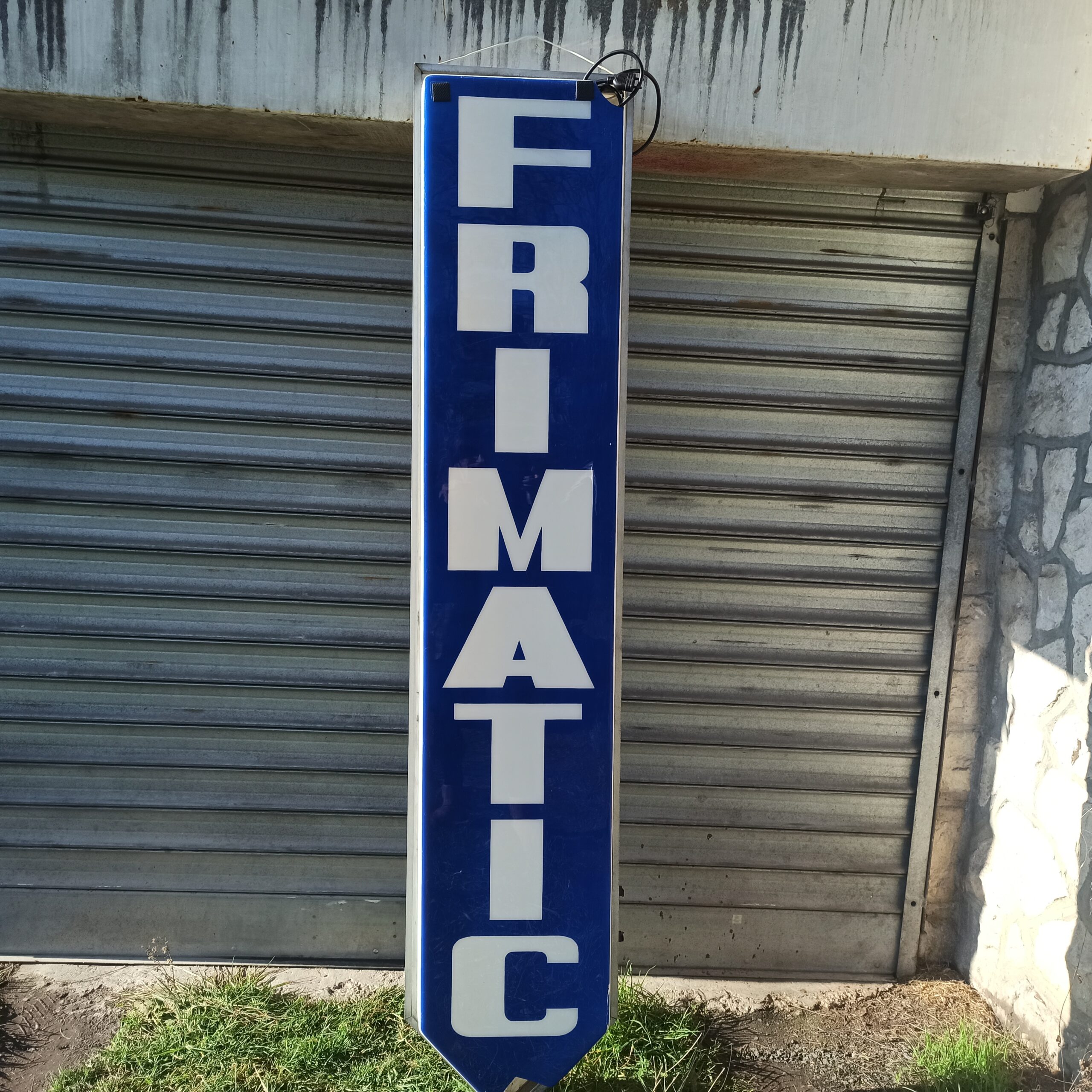 Ancienne grande enseigne lumineuse vintage. Deux possibilités: une version Vedette et une autre FRIMATIC. Electricité à revoir. Quelques petits manques. Belle pièce vintage déco rétro. Longueur 200. Largeur 50.