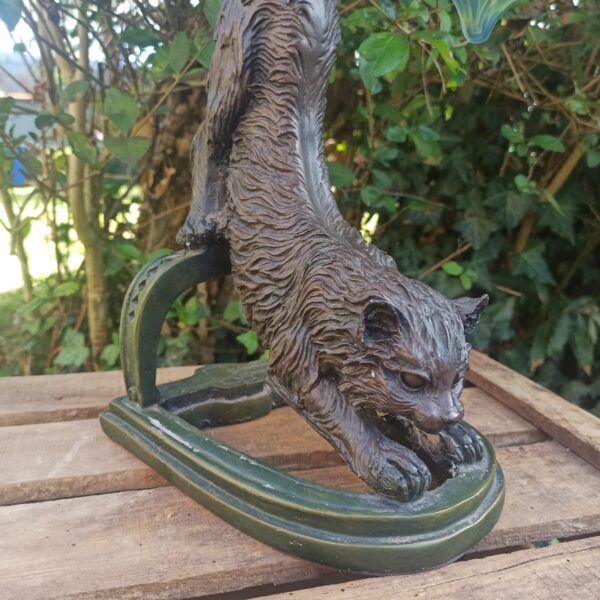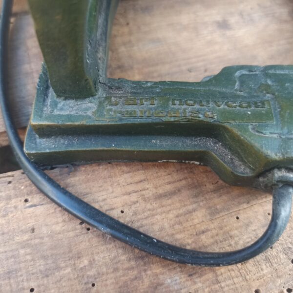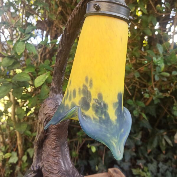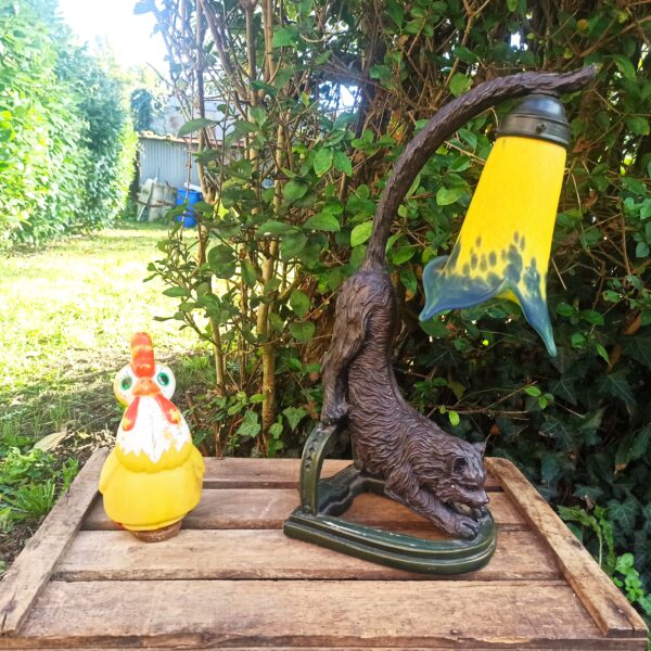 Lampe à poser. Epoque art nouveau. Chat en régule. Joli abat jour en pâte de verre. Fonctionne. Câblage neuf. Largeur 20. Hauteur 45.