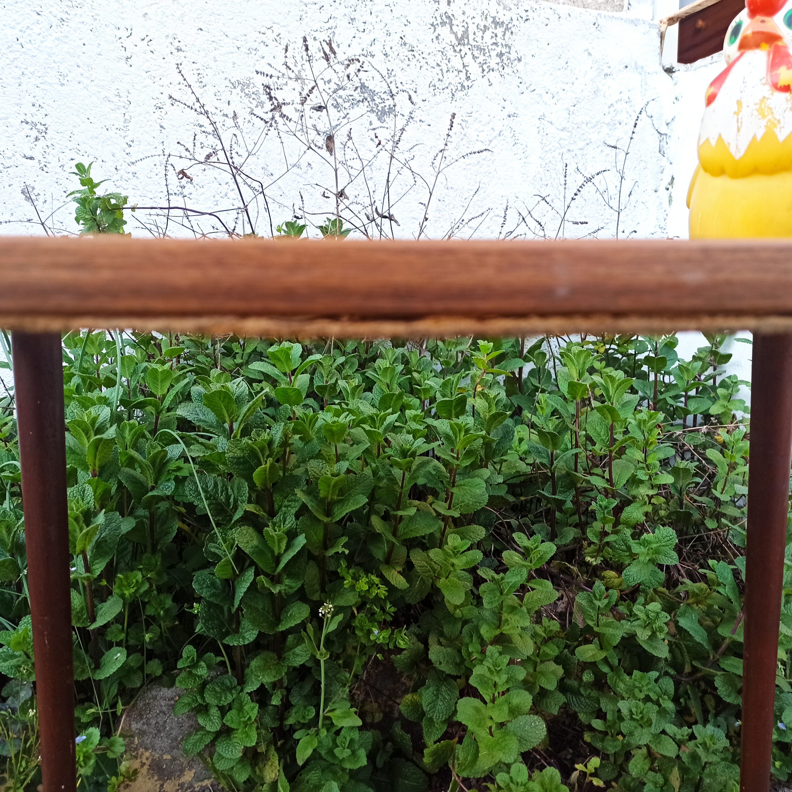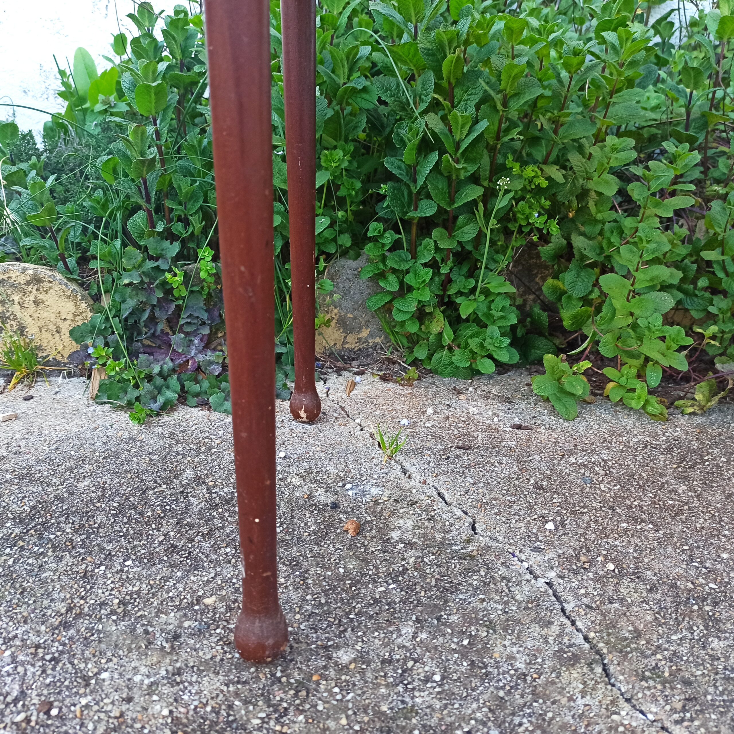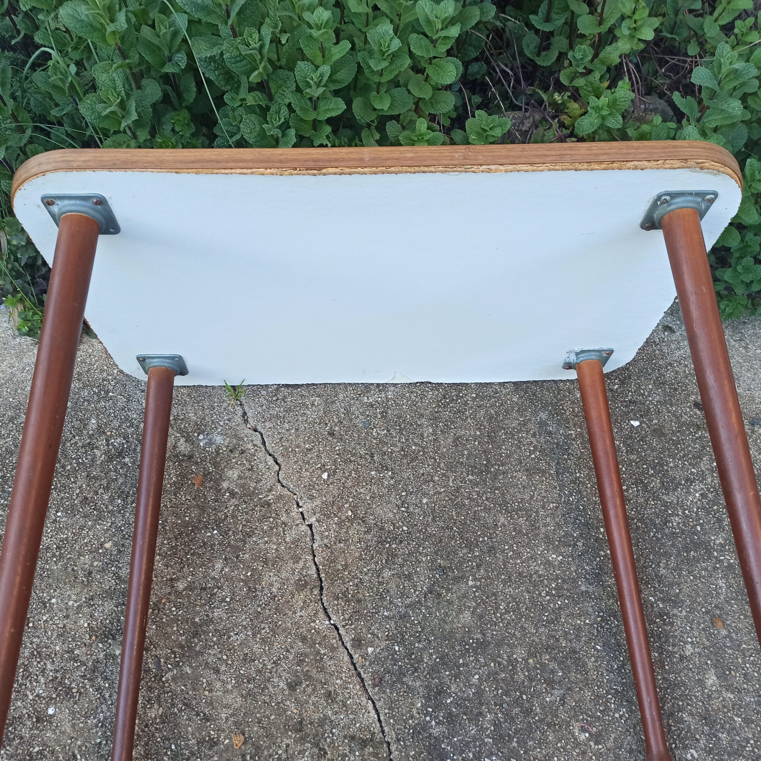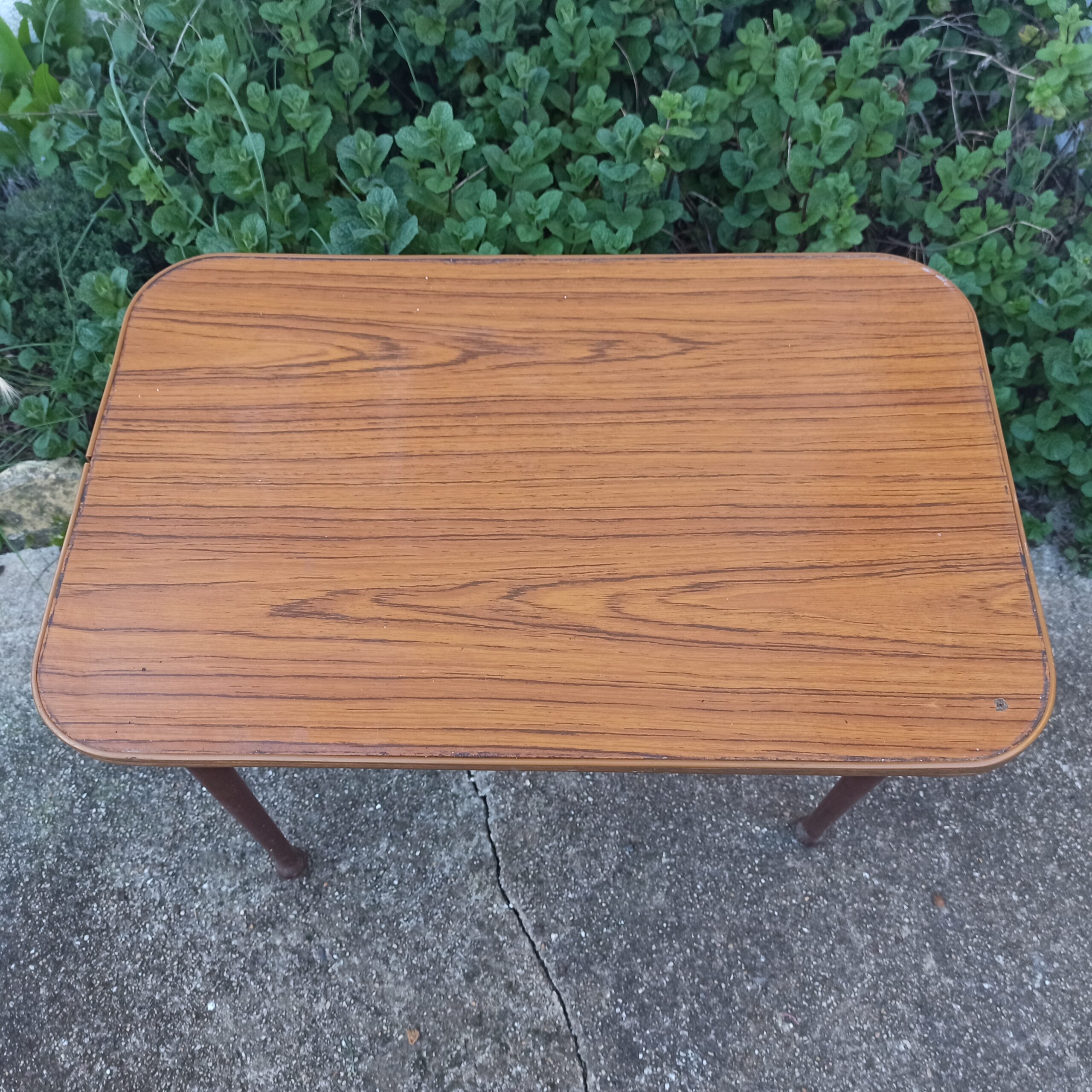 Petite table en bois et placage formica marron. Pieds en bois, bouts arrondis. Marques du temps. Hauteur 43. Largeur 36. Longueur 56.