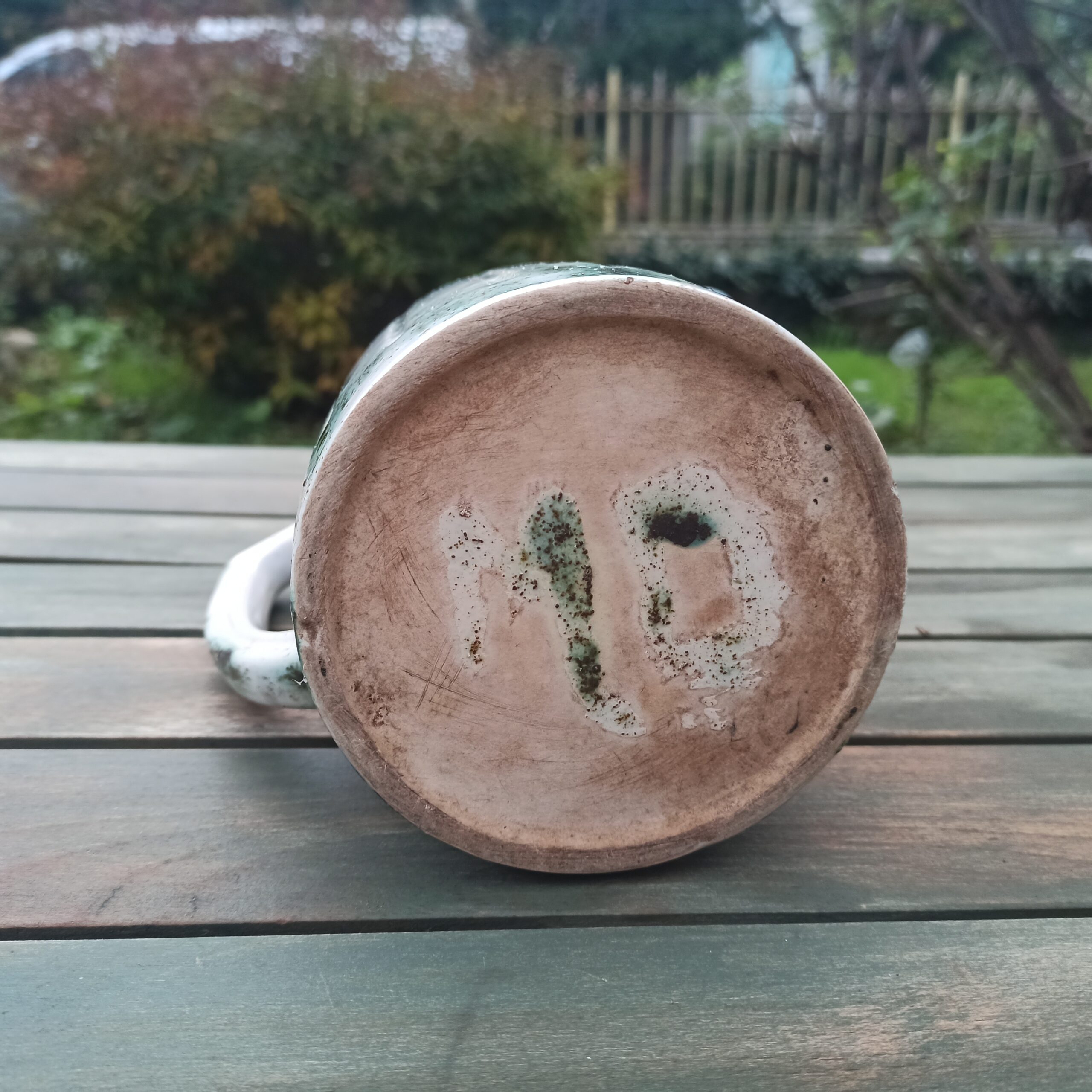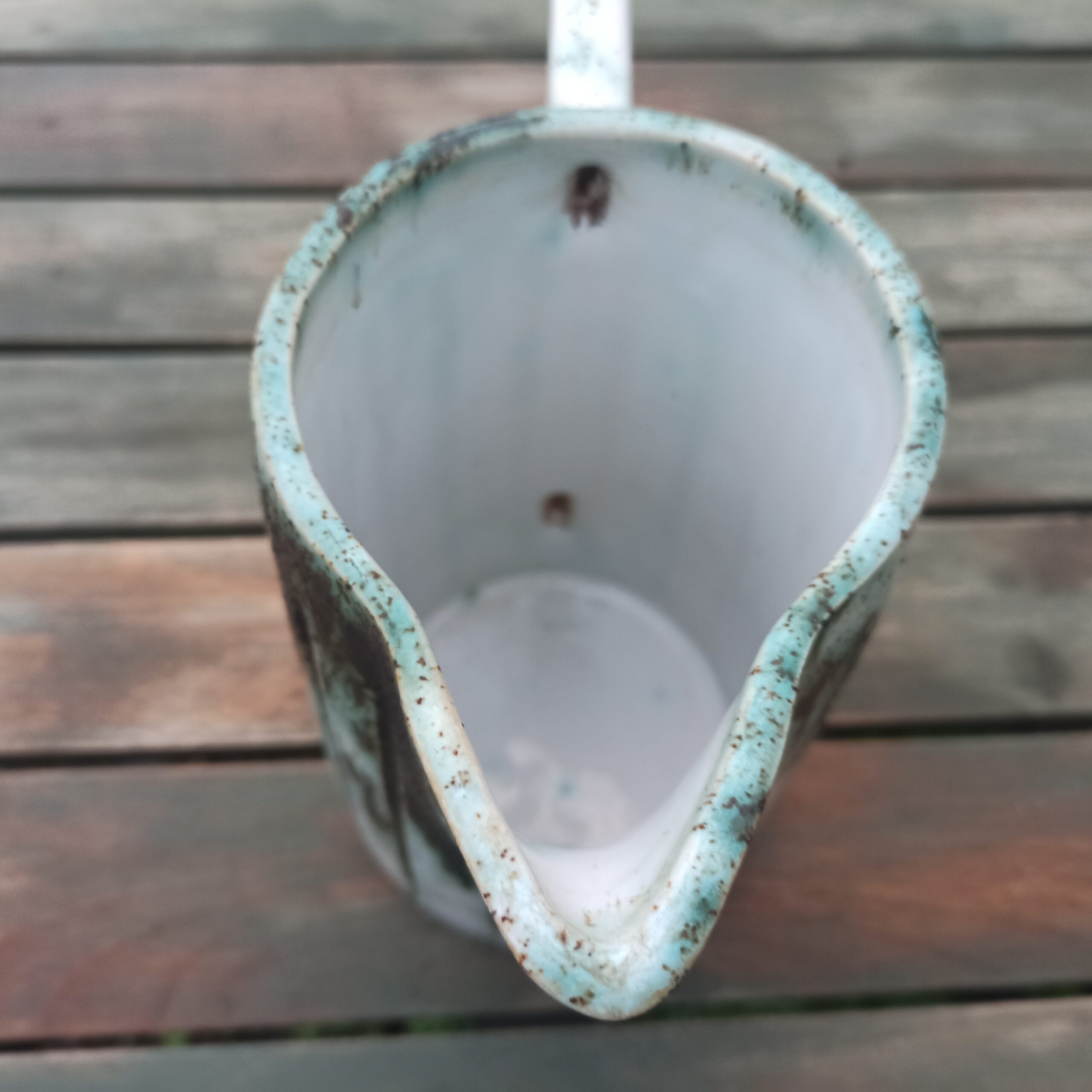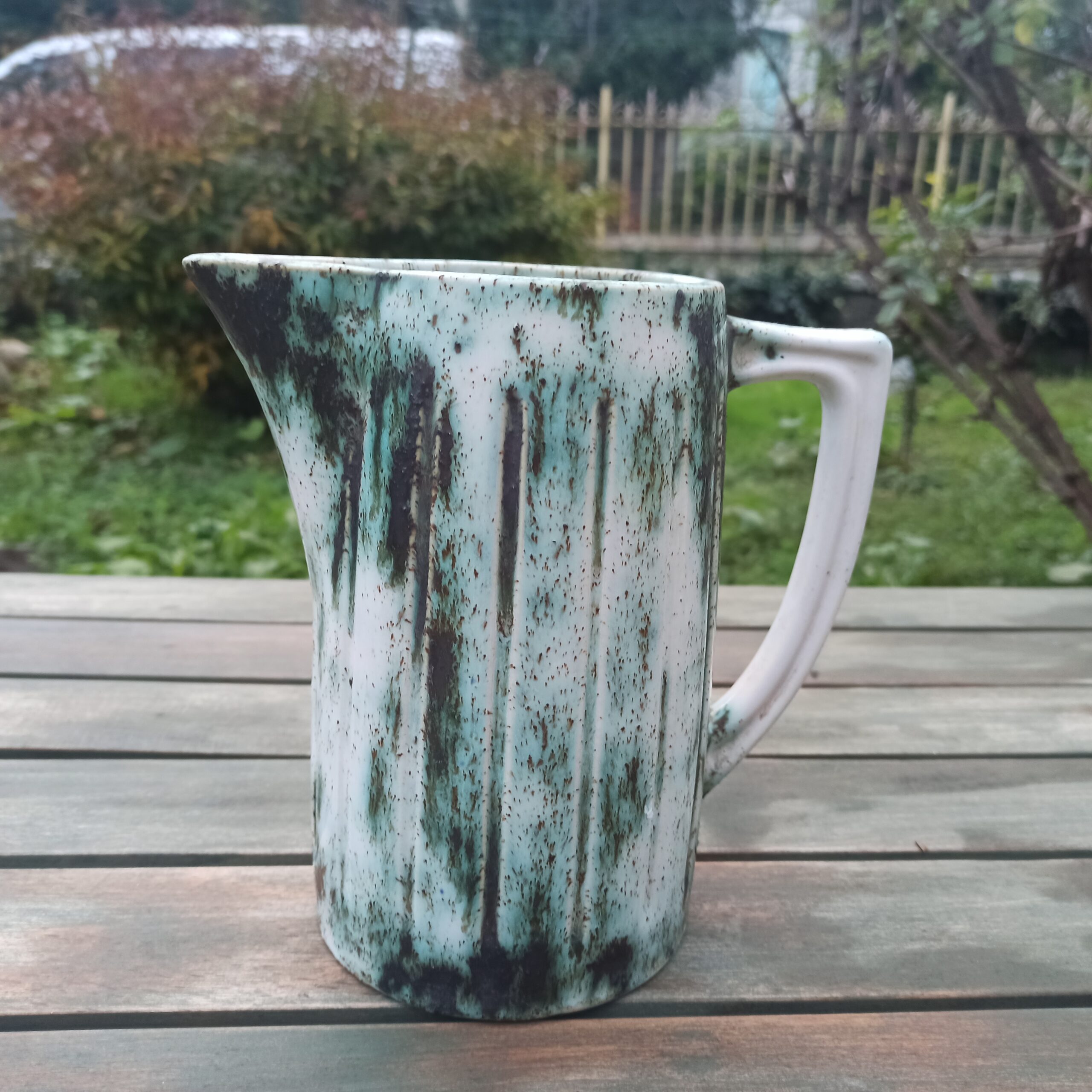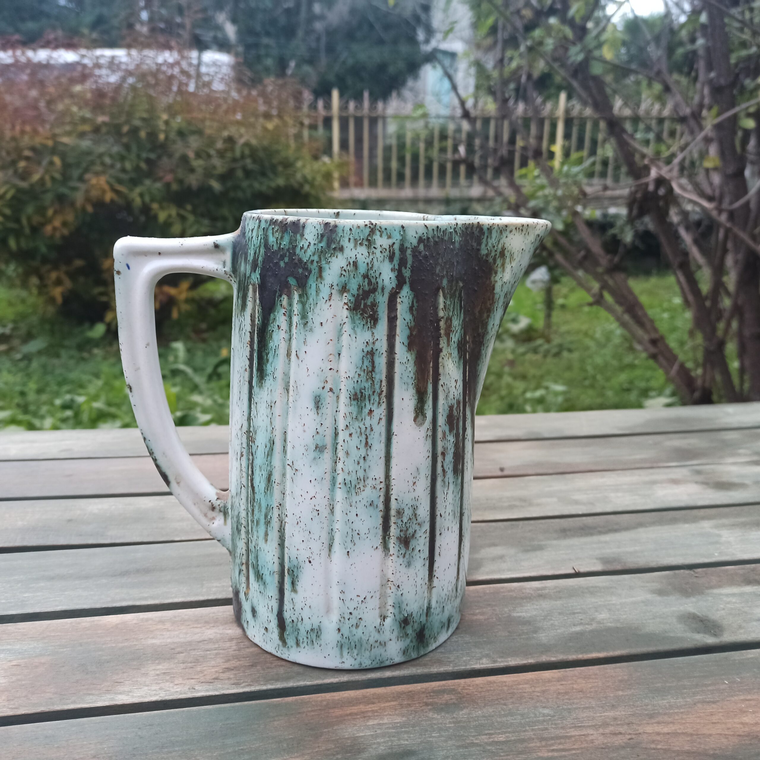 Joli pichet en céramique. Fond blanc et traces de vert. Pas d’éclat. Hauteur 21. Largeur 12.