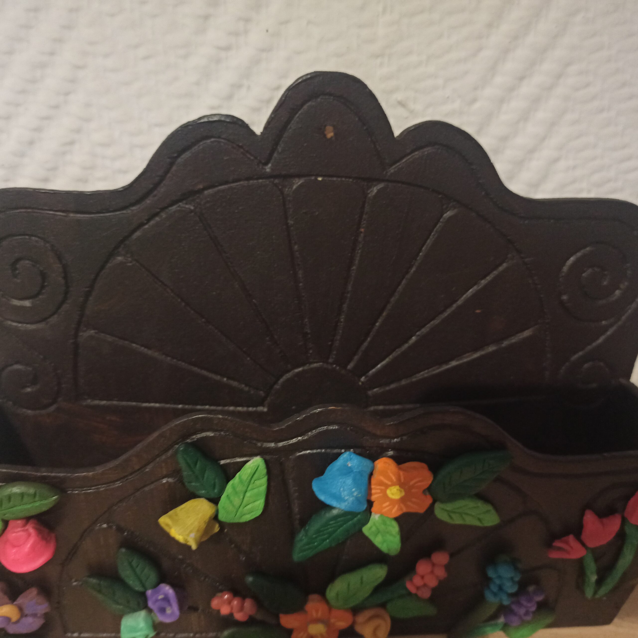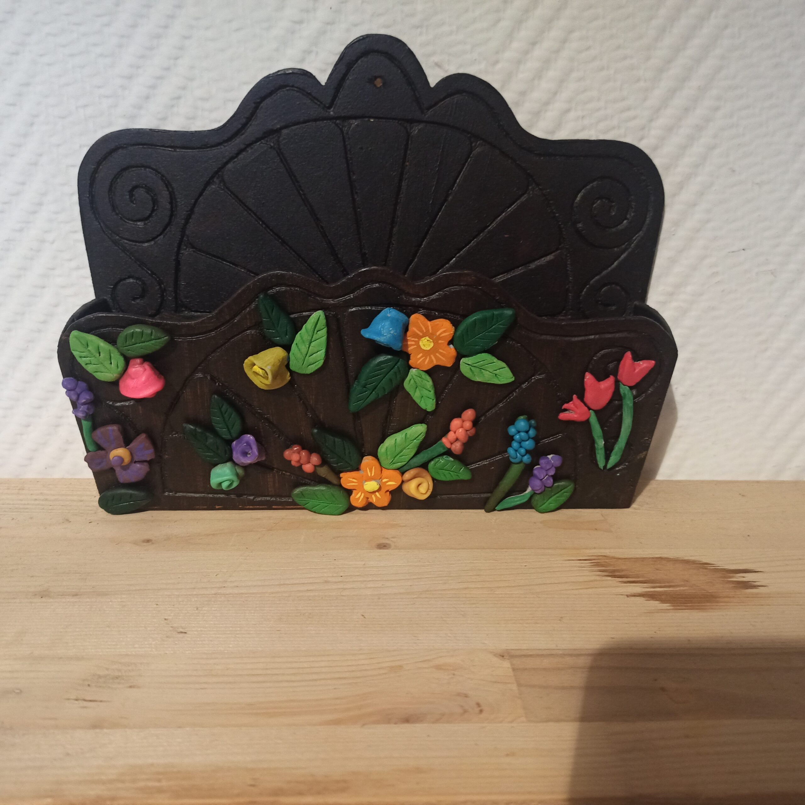 Ancien porte courrier en bois. Customisé avec de la pâte auto durcissante. Fragile. Décor floral. Beau rendu bohème rétro. Hauteur 20. Longueur 26. Profondeur 6.