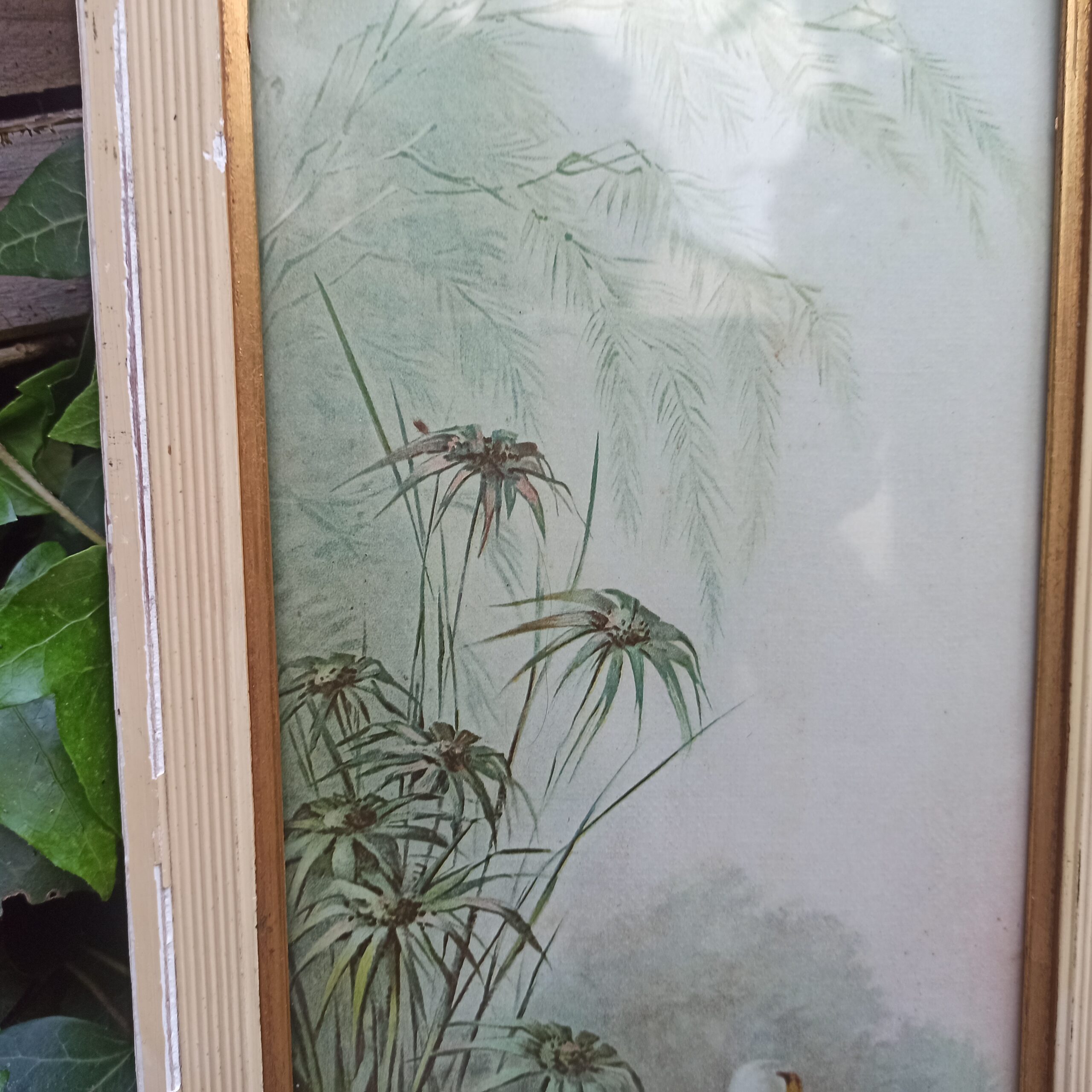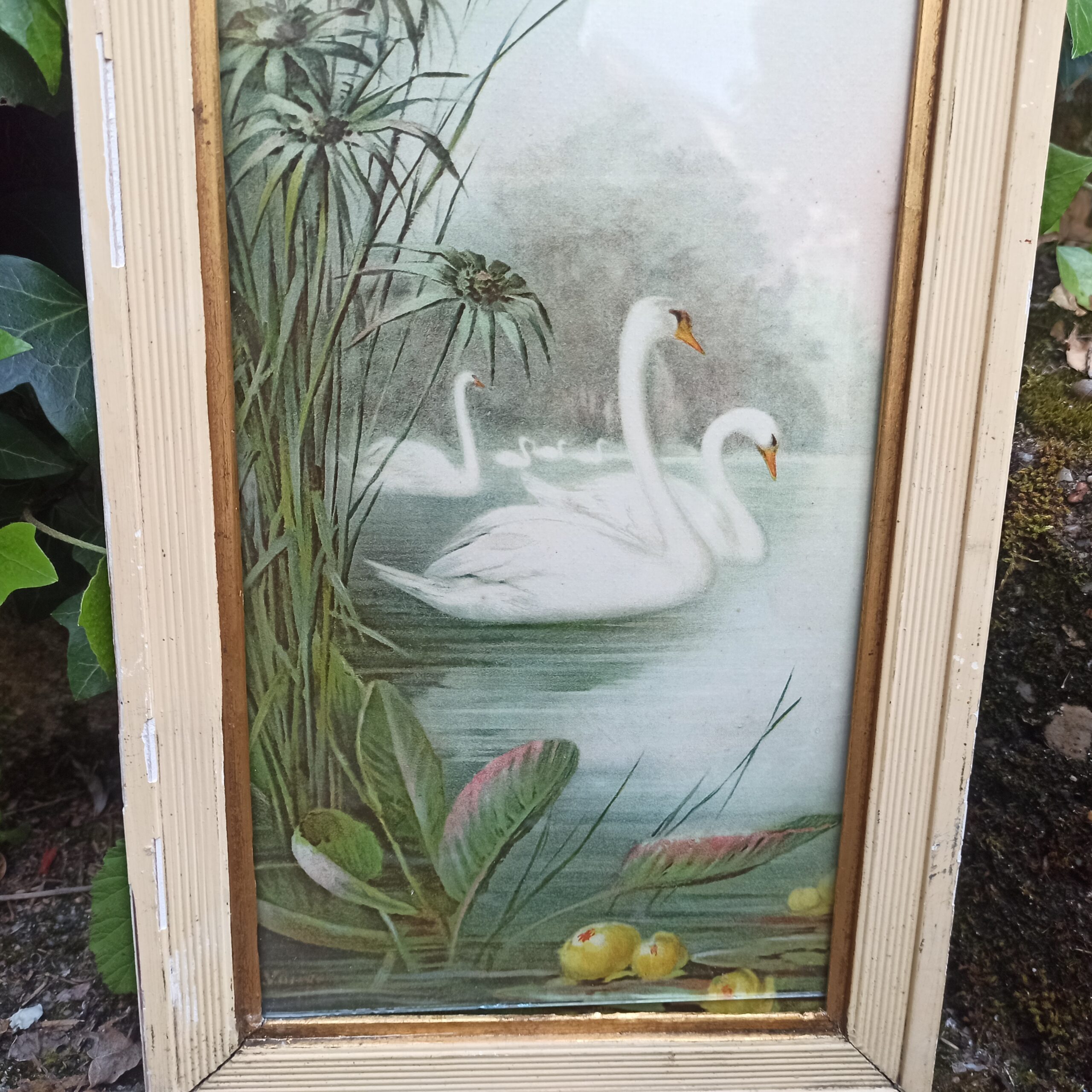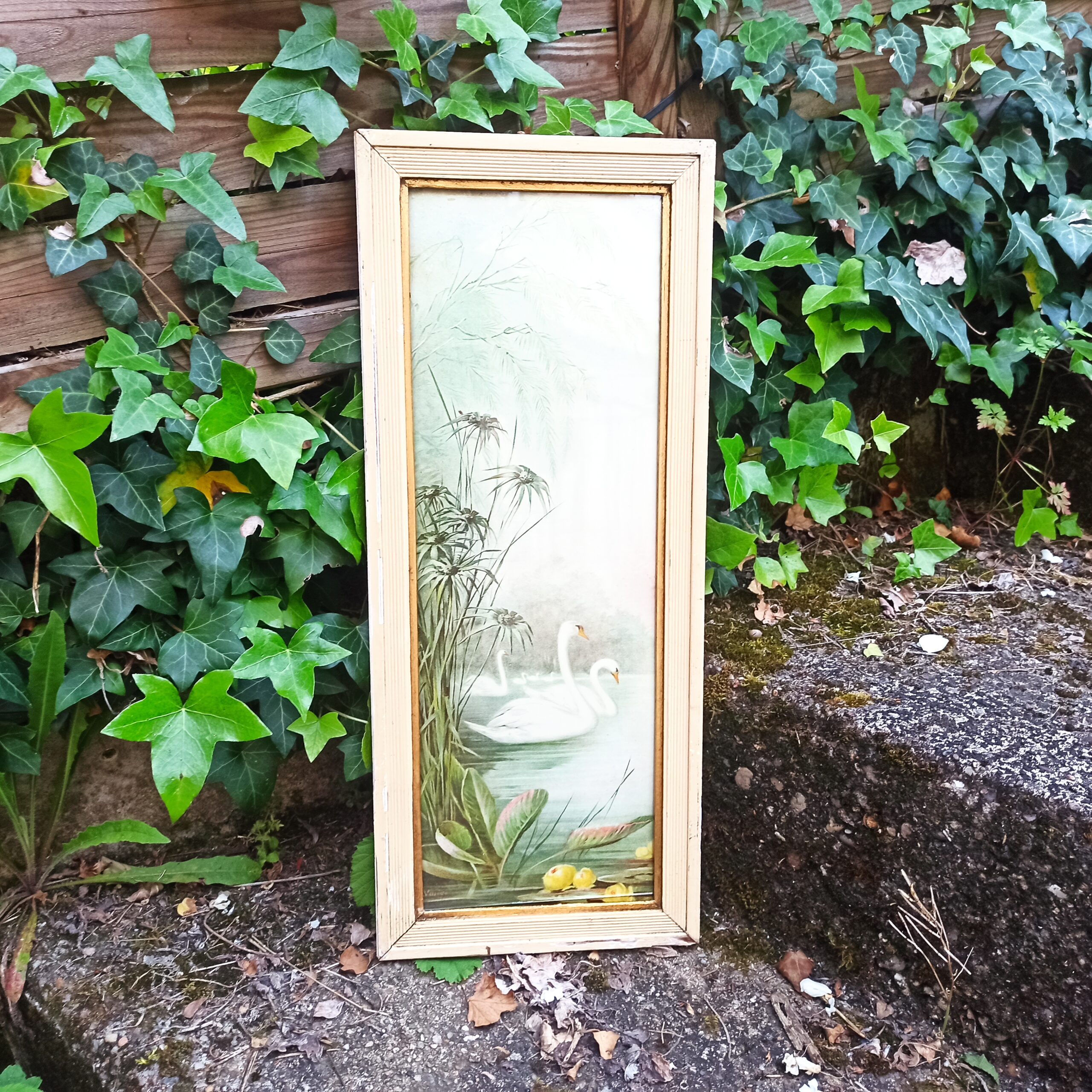 Reproduction d’après une œuvre d’Emilie Vouga. Représentant des cygnes. Cadre ancien en bois. Etat moyen. 20×50.