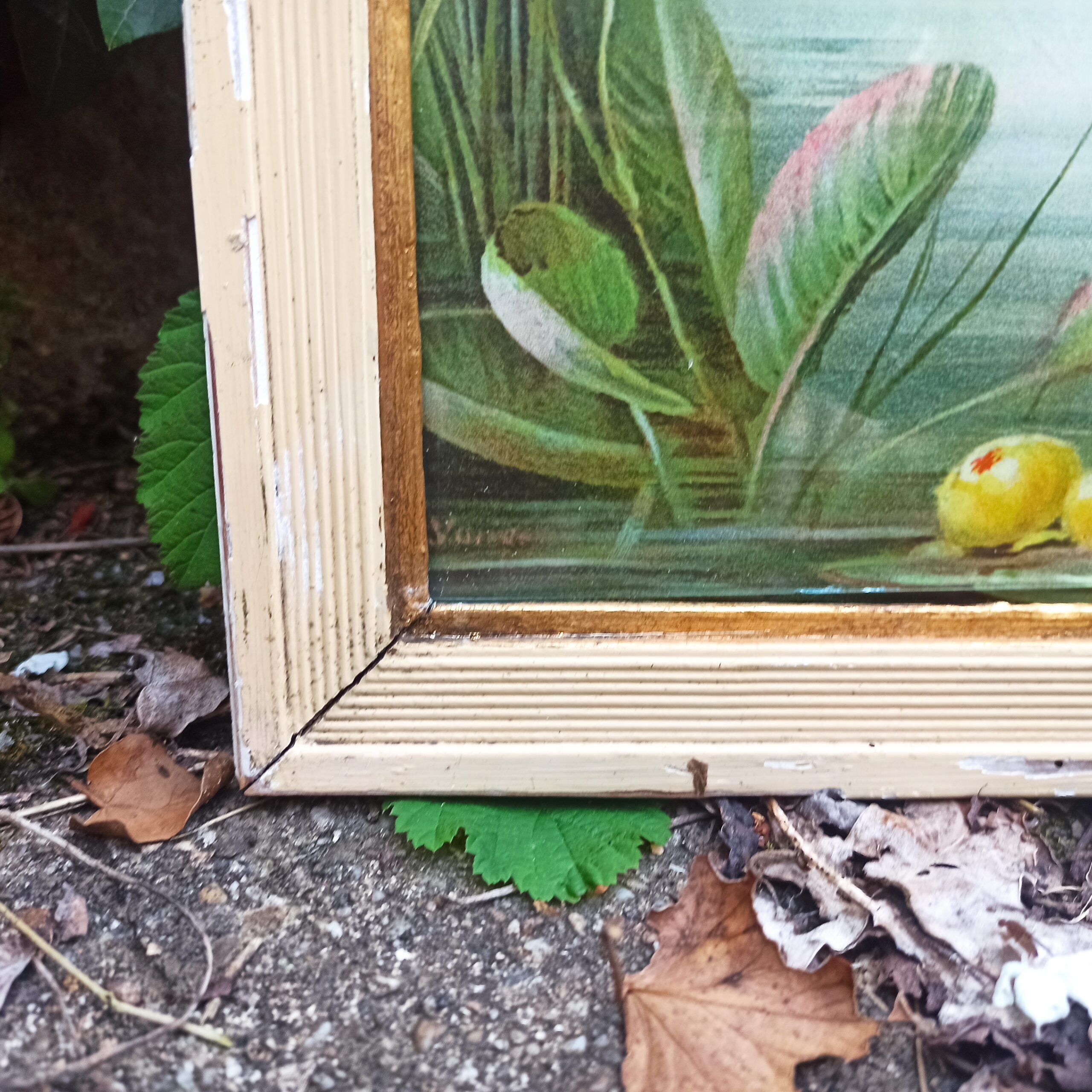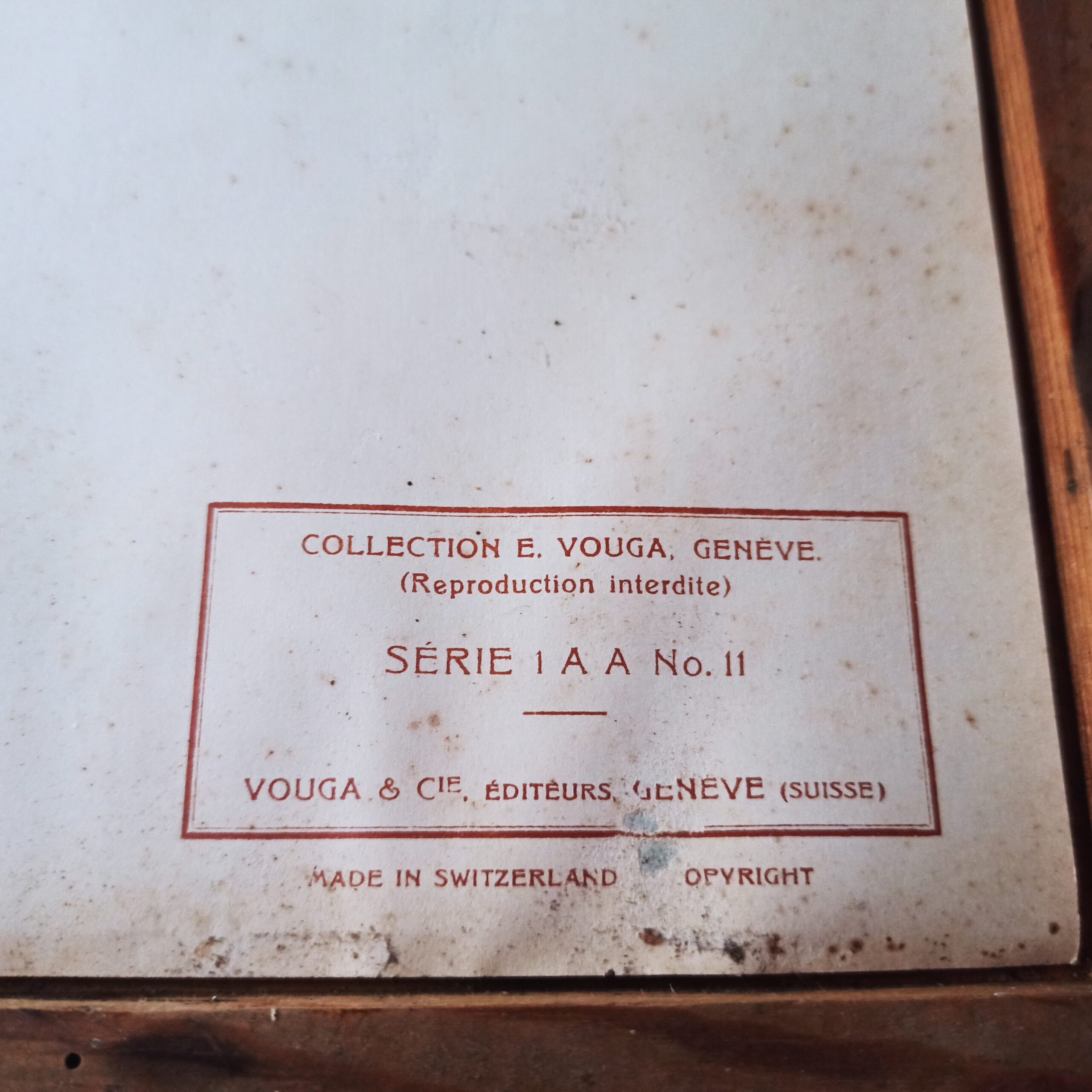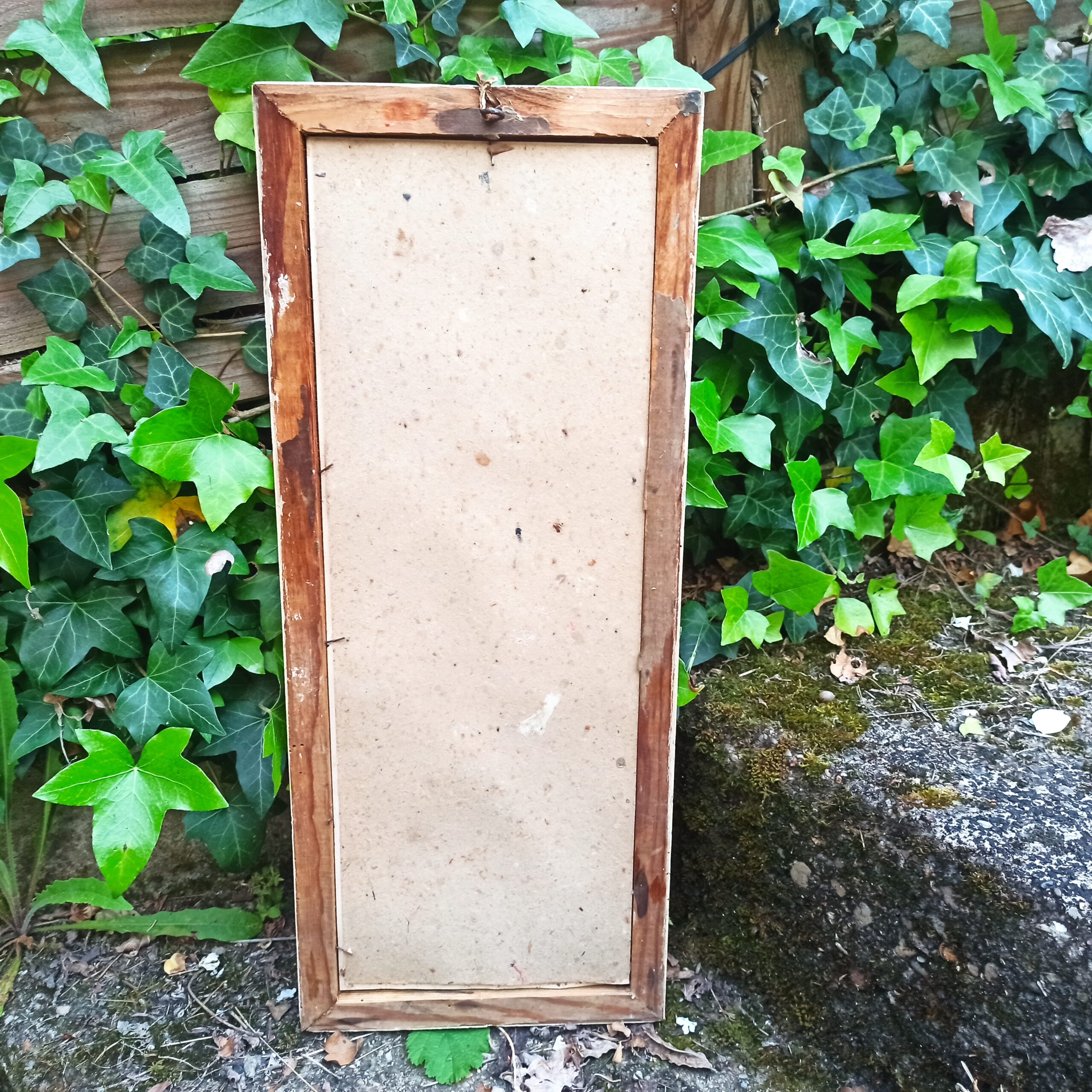 Reproduction d’après une œuvre d’Emilie Vouga. Représentant des cygnes. Cadre ancien en bois. Etat moyen. 20×50.