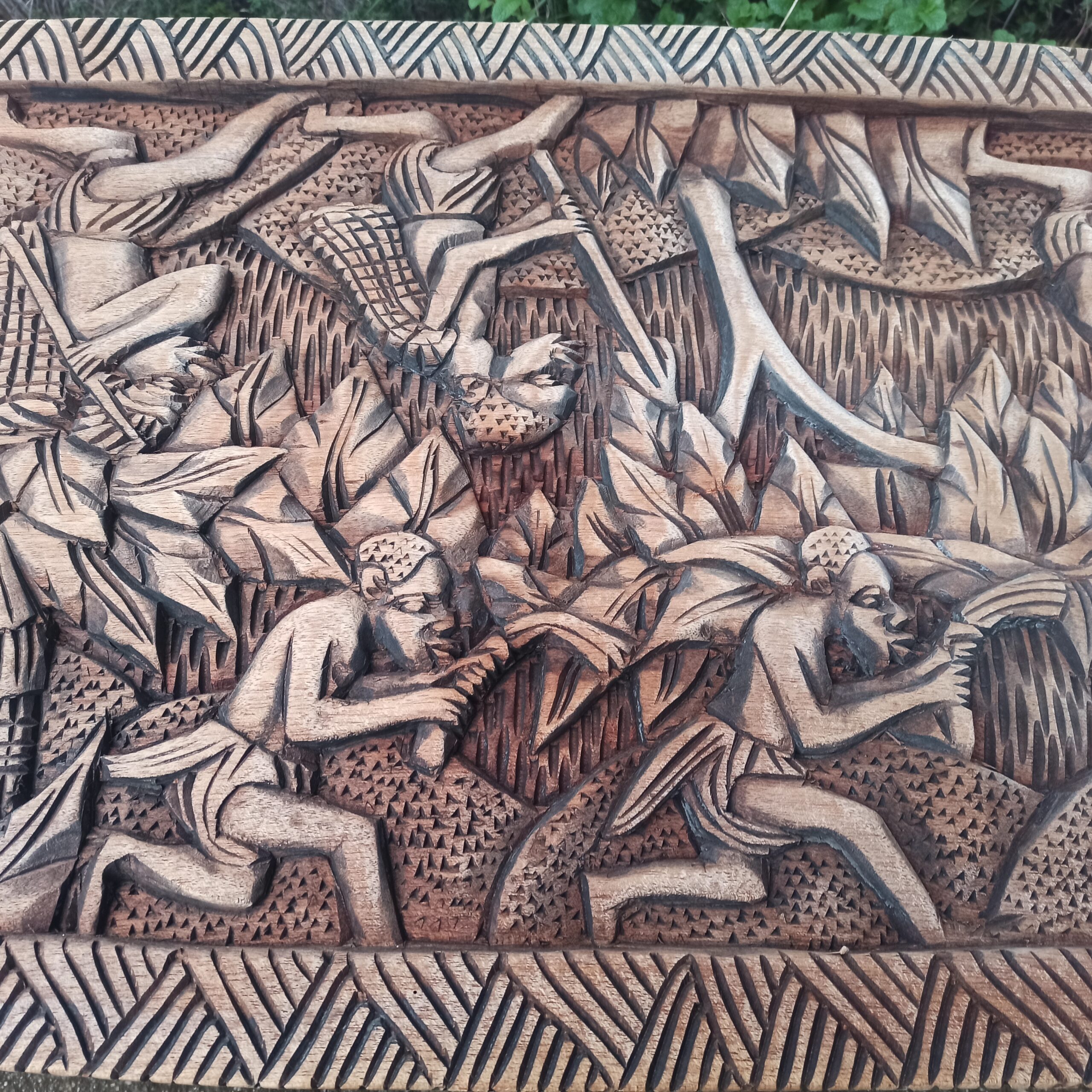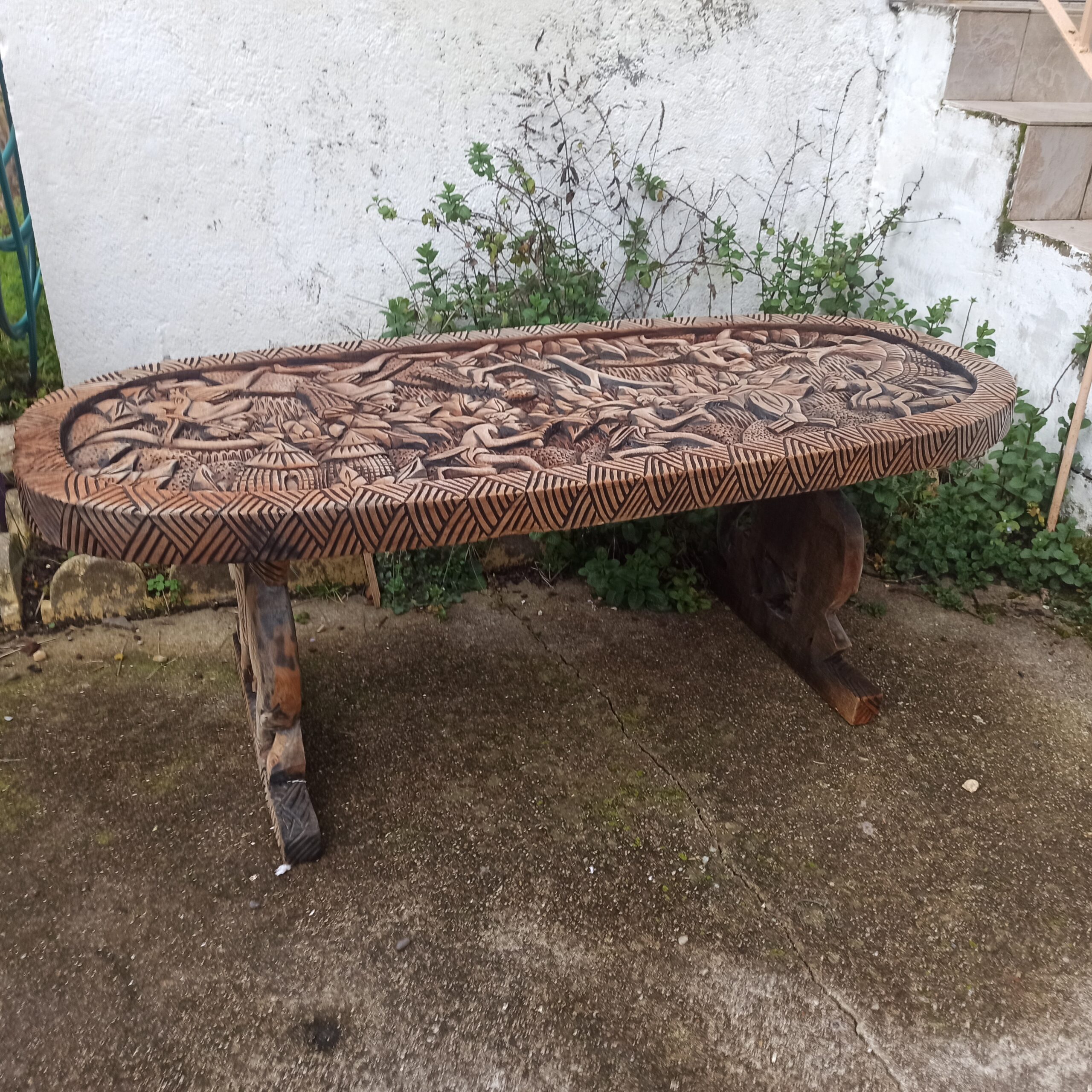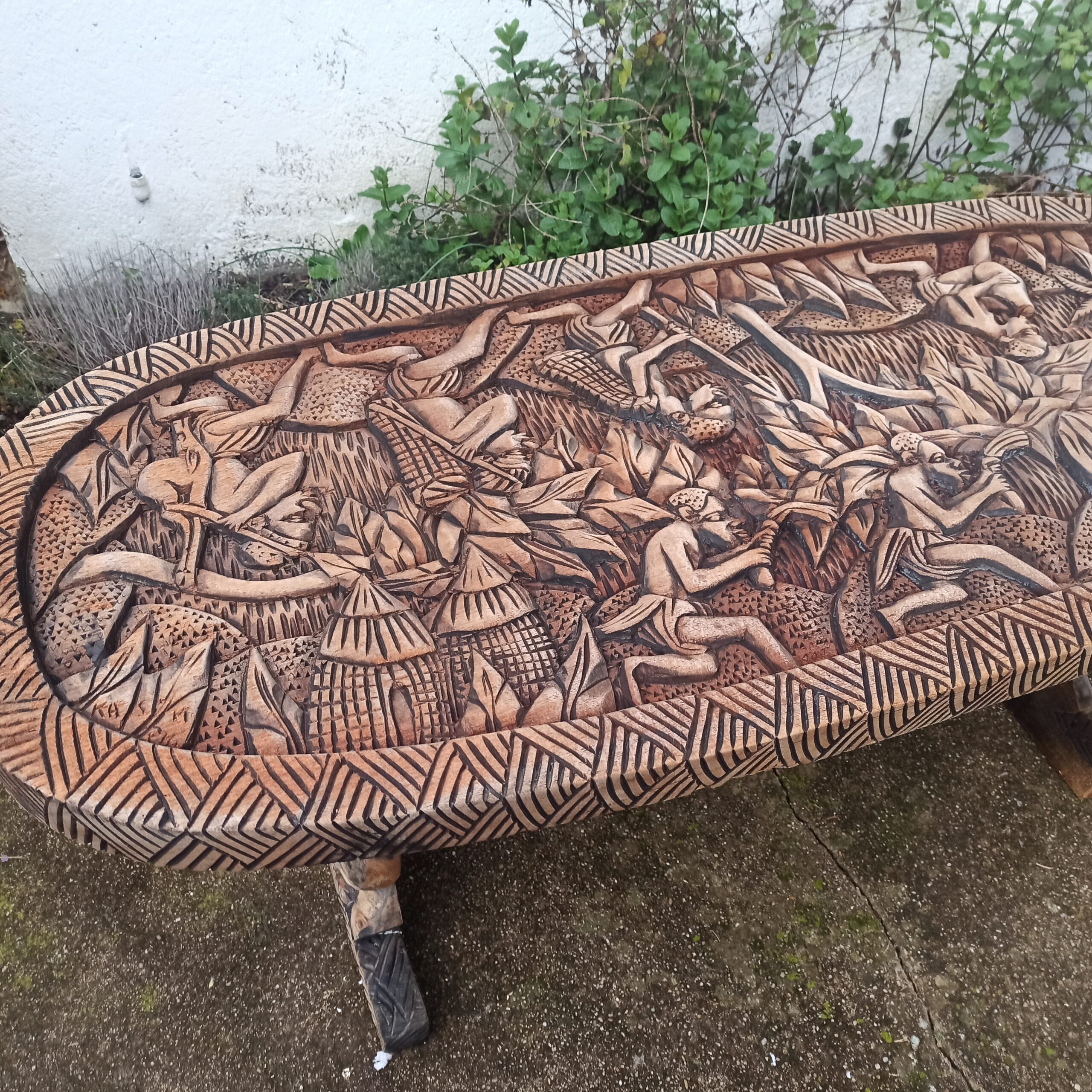 Table basse art africain vintage. Achetée dans les années 90. Lourde et robuste. Beau travail artisanal. Déco ethnique. Scènes de vie. 122×53. Hauteur 43.