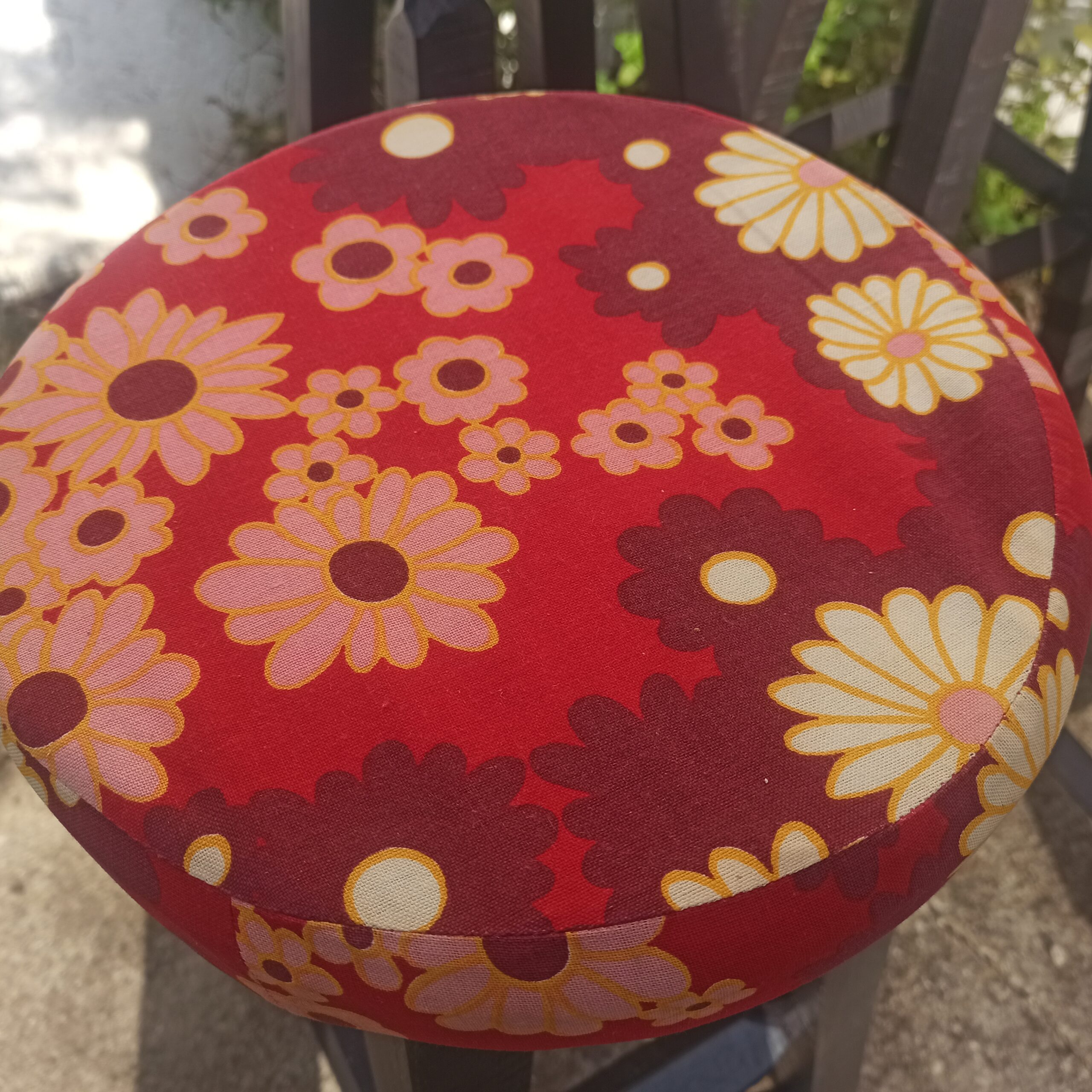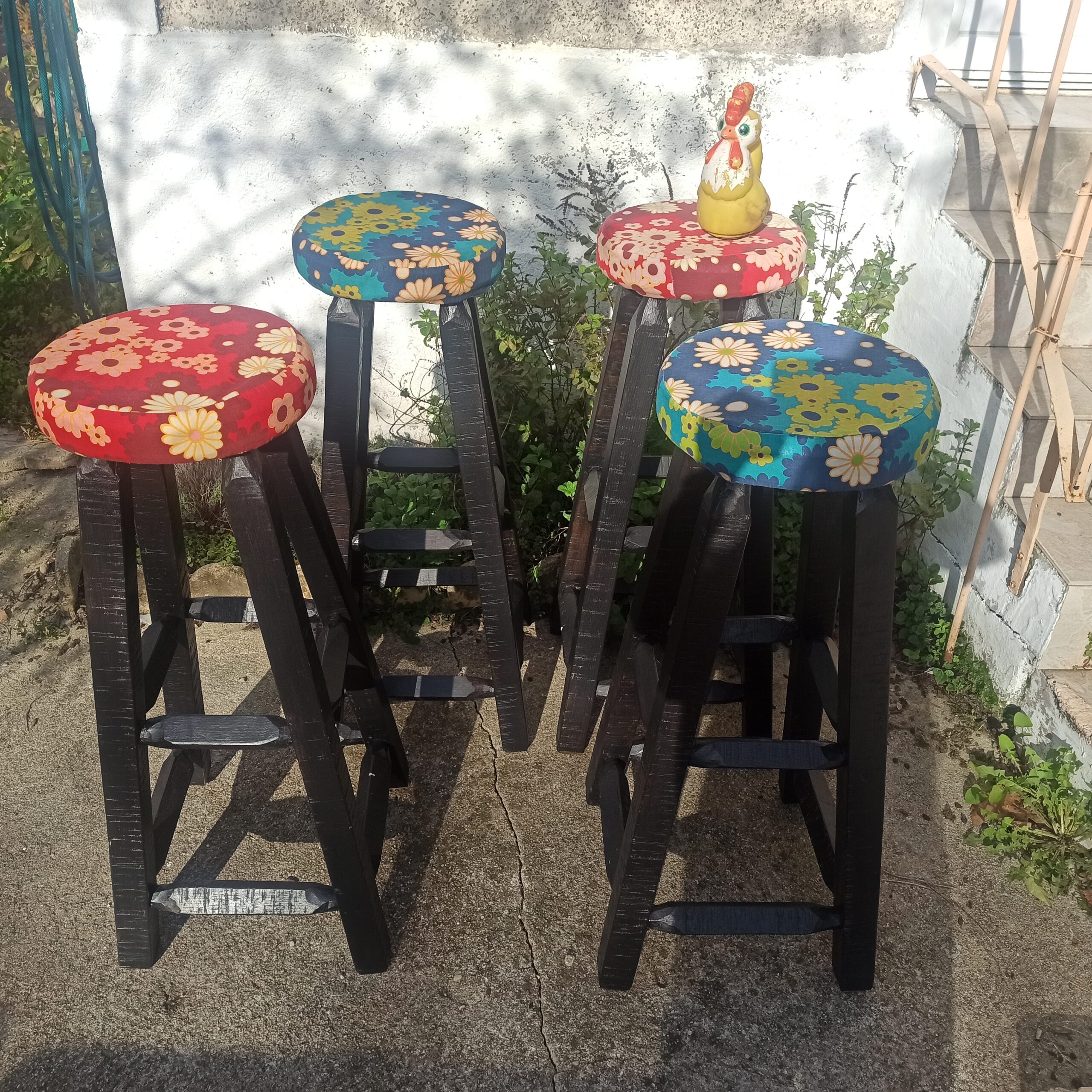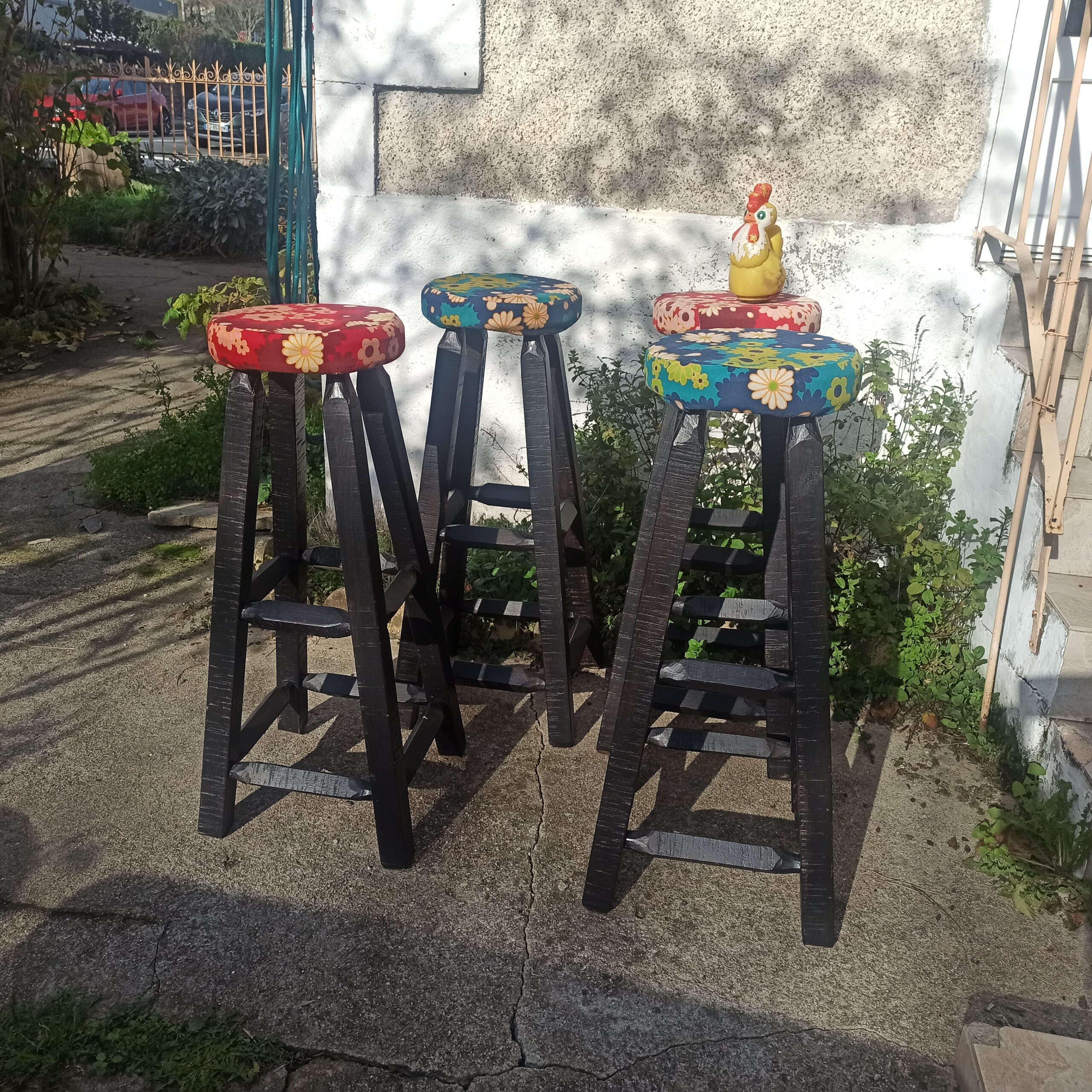 4 tabourets de bar en bois. Lourds et robustes. Traces du temps, mais bel état général. Housses 100% vintage. Coloris rouge et bleu. Tissu floral. Structure bois noir mat. Hauteur 86. Diamètre assise 28.