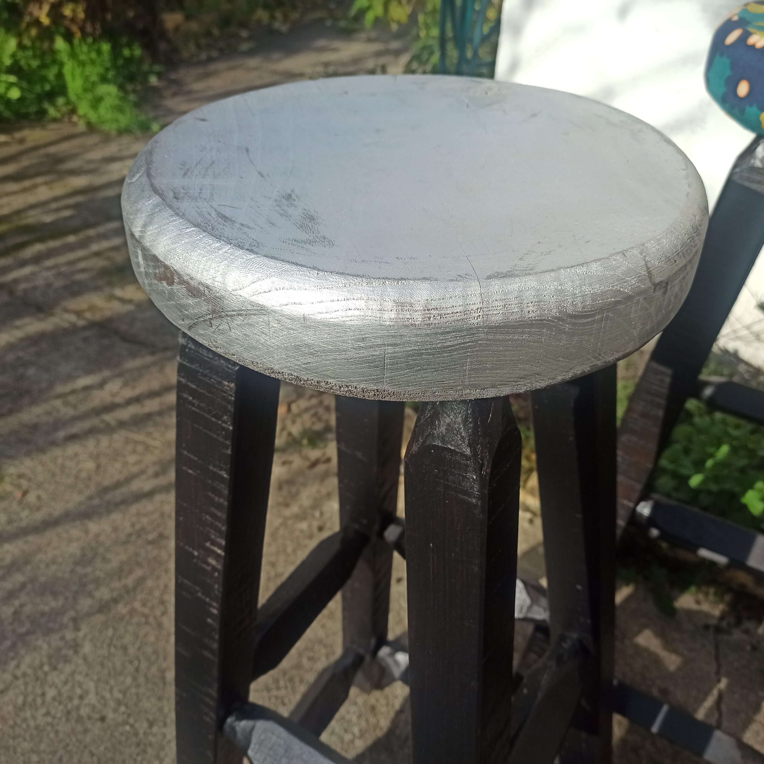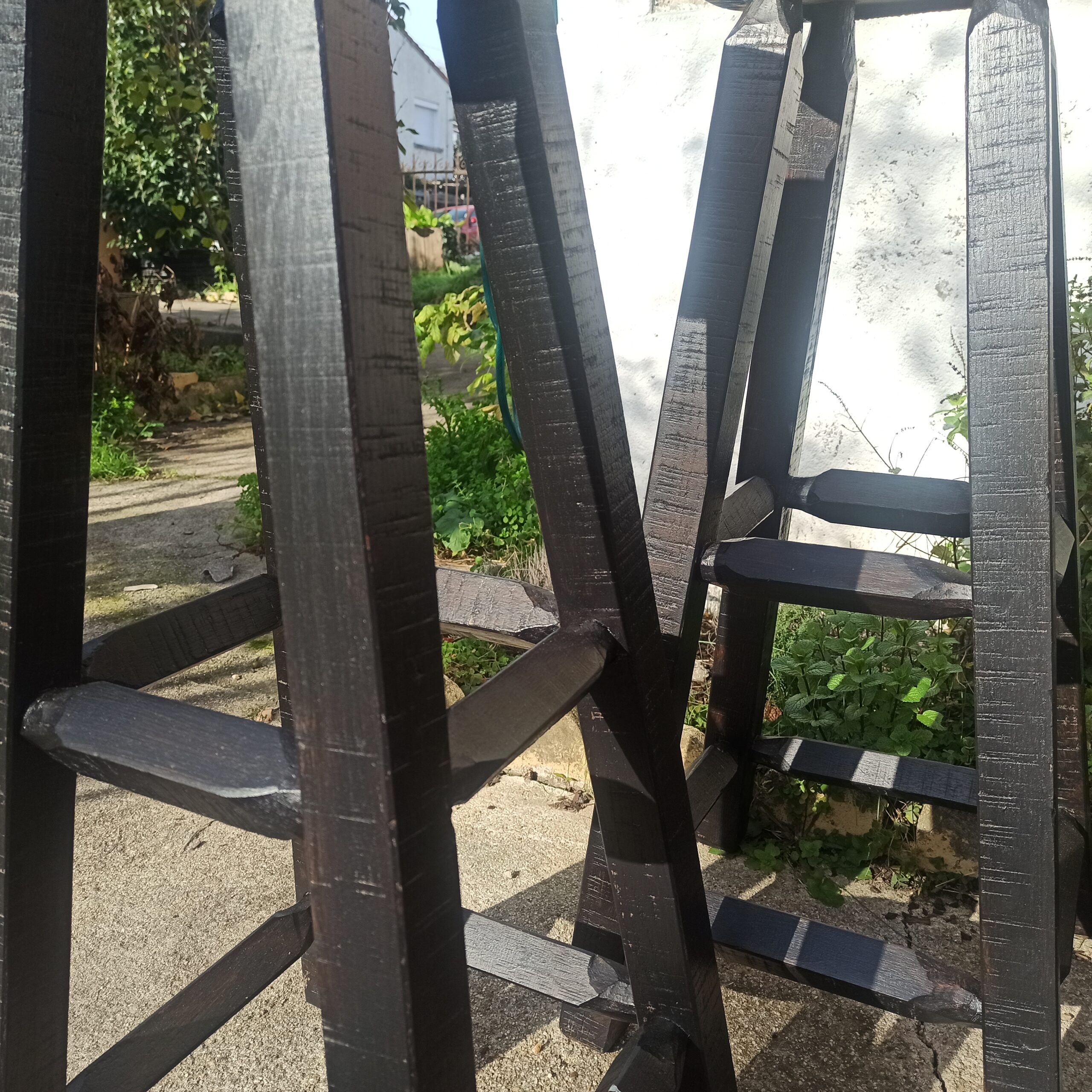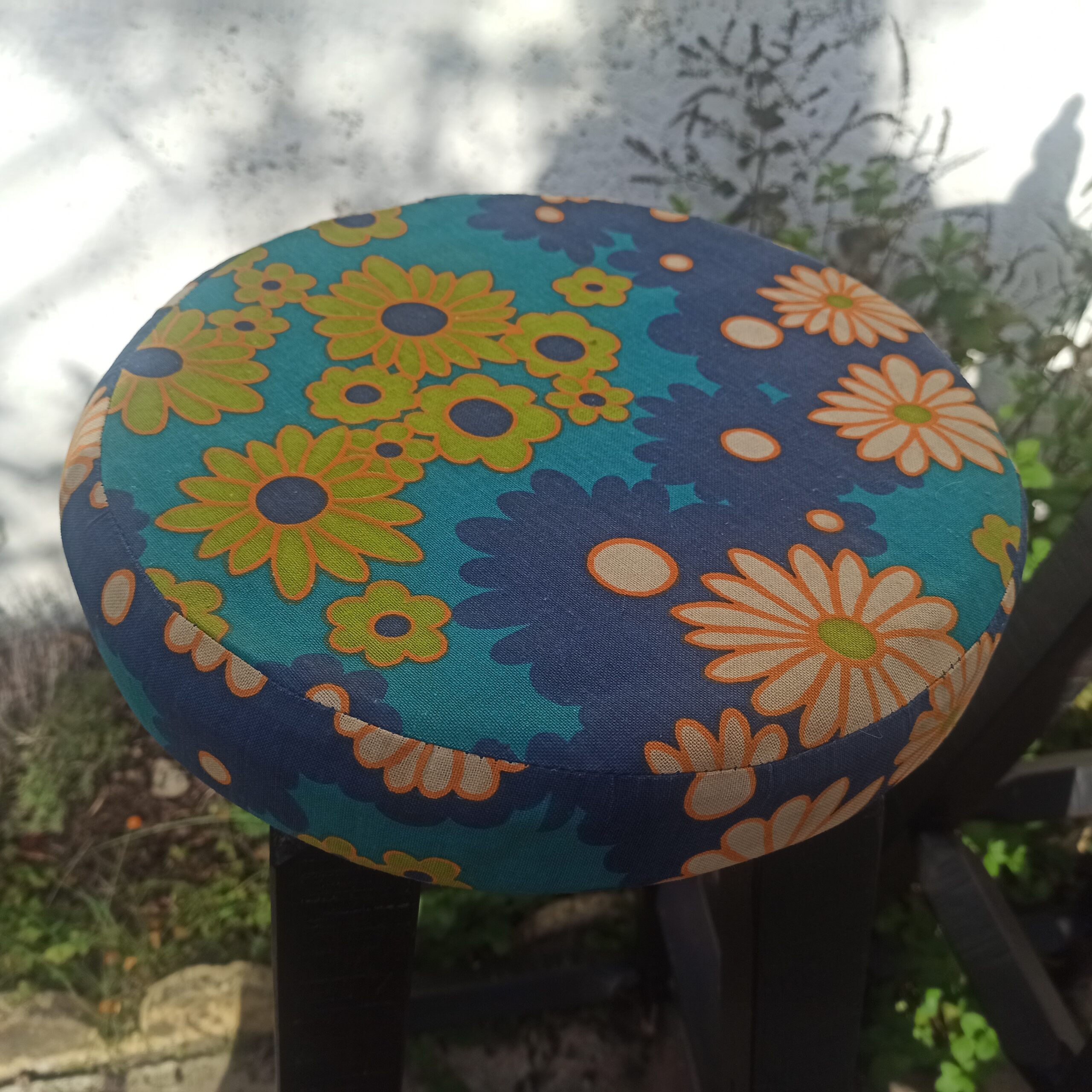 4 tabourets de bar en bois. Lourds et robustes. Traces du temps, mais bel état général. Housses 100% vintage. Coloris rouge et bleu. Tissu floral. Structure bois noir mat. Hauteur 86. Diamètre assise 28.